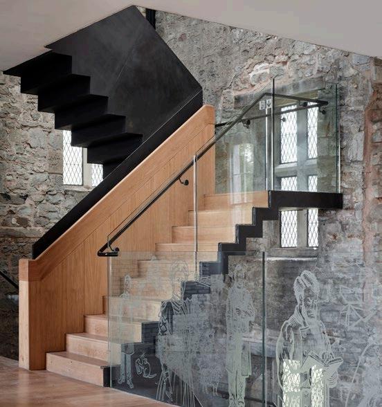 Floating hand-patenated steel stair clad in locally supplied oak. Glass balustrade provides views to historic stone walls, etched with interpretative illustrations
