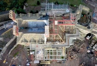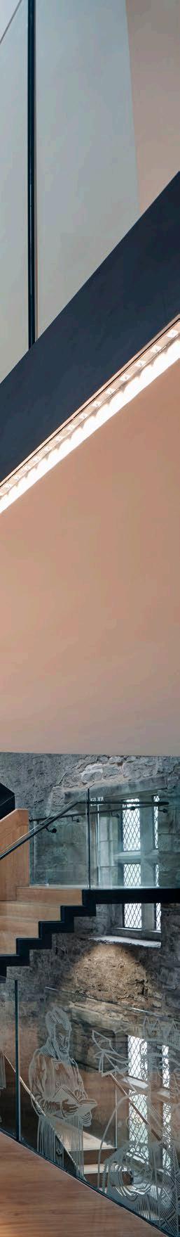 The project brief involved a phased masterplan for the castle site, including restoration and reopening of the ancient timber gates, a reimagined derelict triple-height fire-damaged portion of the castle house, and an enlivened accessible proposal for the promontory campus linking disparate elements and bringing contemporary international-standard improvements to build on the town’s unique reputation for arts and literature, as the ‘town of books’ and the home of Hay Festivals. The now-public venue delivers a museumstandard exhibition gallery, a heritage learning and education suite of community spaces, interpretative and safe access to medieval areas, a reception hall for events, a restaurant and commercial kitchen, a bookshop, a reading room, public realm and landscape improvements, and staff facilities.