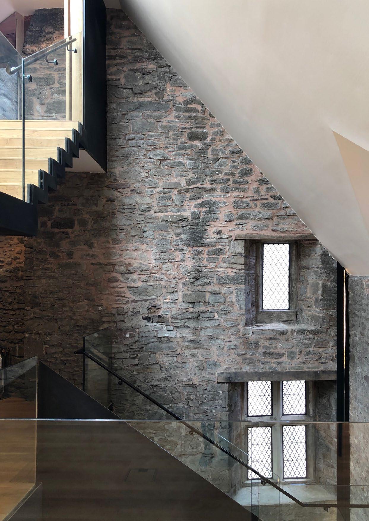 After - Elegant clean lines of a new feature stair, animates the re-enclosed East Mansion space beneath, and provides circulation to all levels within the restored castle walls