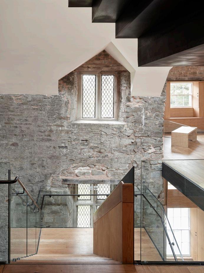 As the site suffered two significant fires in the 20C, where internal historic elements and furnishings were sadly lost, we approached the roofless portion of the Jacobean house especially as an opportunity for judicious contemporary insertions for gathering and linking disparate floor levels; a generous, top-lit, and breathtaking heart for the castle. Deep balconied floor plates that retain openness and honour the characterful historic stone and timber remaining fabric provide new flexible spaces for entry, wayfinding, meeting and celebrating, and a new cascading stair lined in warm oak helps tie the surrounding original walls back together under a new insulated warm roof. These new elements, including a discreet lift that provides step-free access, bring visitors to the uppermost levels of the castle, allowing new interpretations of the medieval tower keep, and lead out to a new viewing platform and eagle’s lookout, commanding the strategic views over the surrounding Wye River valley the castle was first built to provide. Other areas of the Jacobean house were restored and converted for adaptable use for events and restaurant, shop, Clore Education suite, and a loans gallery and reading room under a restored original oak structure roof structure.