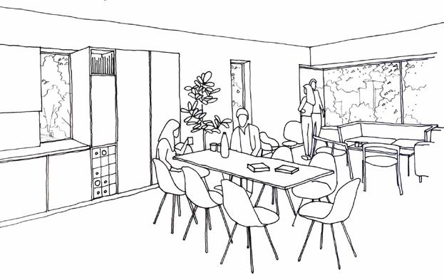 external sloped gardens and frame new ‘outdoor rooms.’ New routes provide greater connectivity to the whole site that respond to the topography and deliver an open space at the heart of the scheme. New tree planting across the site enhances the setting to offer a beautiful and high quality campus community that embraces its existing woodland and brings people close to nature.