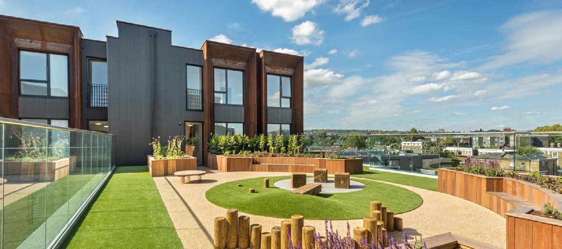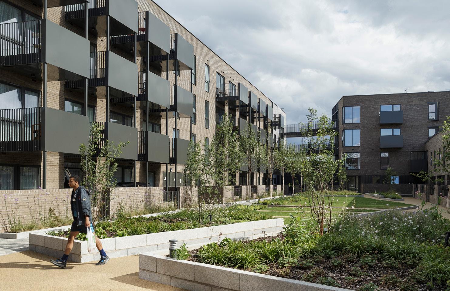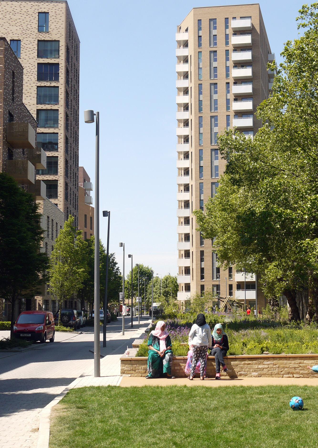 As an isolated typology, the scheme provides no communal amenity space, with the landscaped first floor terrace providing private gardens to maisonettes. Within the context of PDZ6 however, there is plenty of immediate shared green space and playspace. As highlighted, the scheme overlooks the extents of the Olympic Park, with a large play area immediately opposite. There is also a more intimate green space, with additional and differing playspace located along the quieter residential street Villiers Gardens.