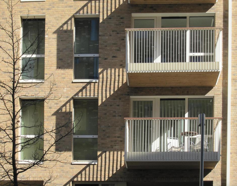 At ground floor, ample front doors and windows open onto, and overlook, the street, creating a sense of activity and natural surveillance. This is further increased by the balconies and terraces at upper floors. Front gardens create a threshold zone from the street, providing some privacy to ground floor homes, and offer opportunities for planting to soften the street edge.