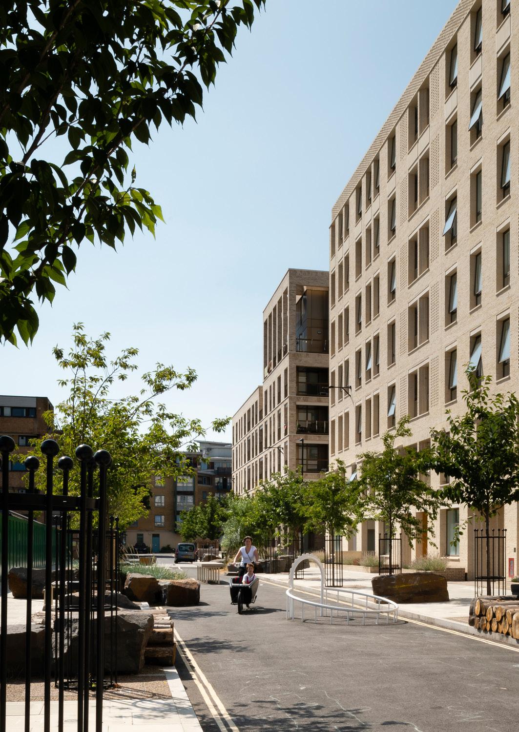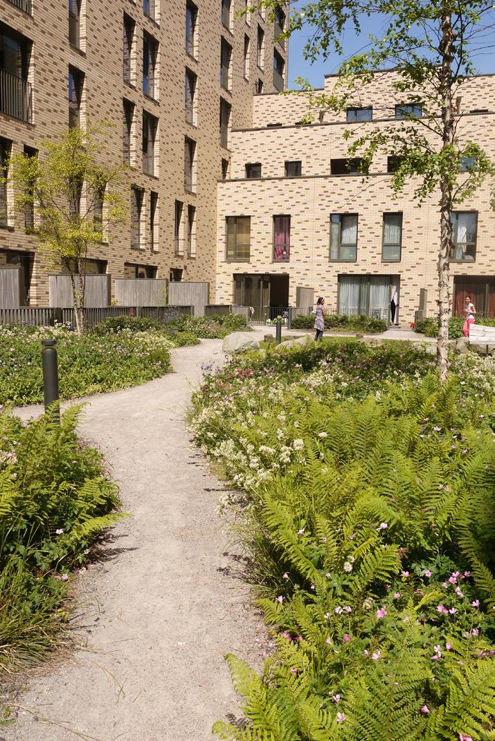 Within the centres of the urban blocks are high quality, landscaped courtyards. There is a rich variety of planting and trees providing opportunities for informal play and relaxation. From street level, double height openings provide views deep into these spaces. Where central massings along Devas Road are reduced to 3 storeys, the amount of southern sunlight is maximised within these spaces.