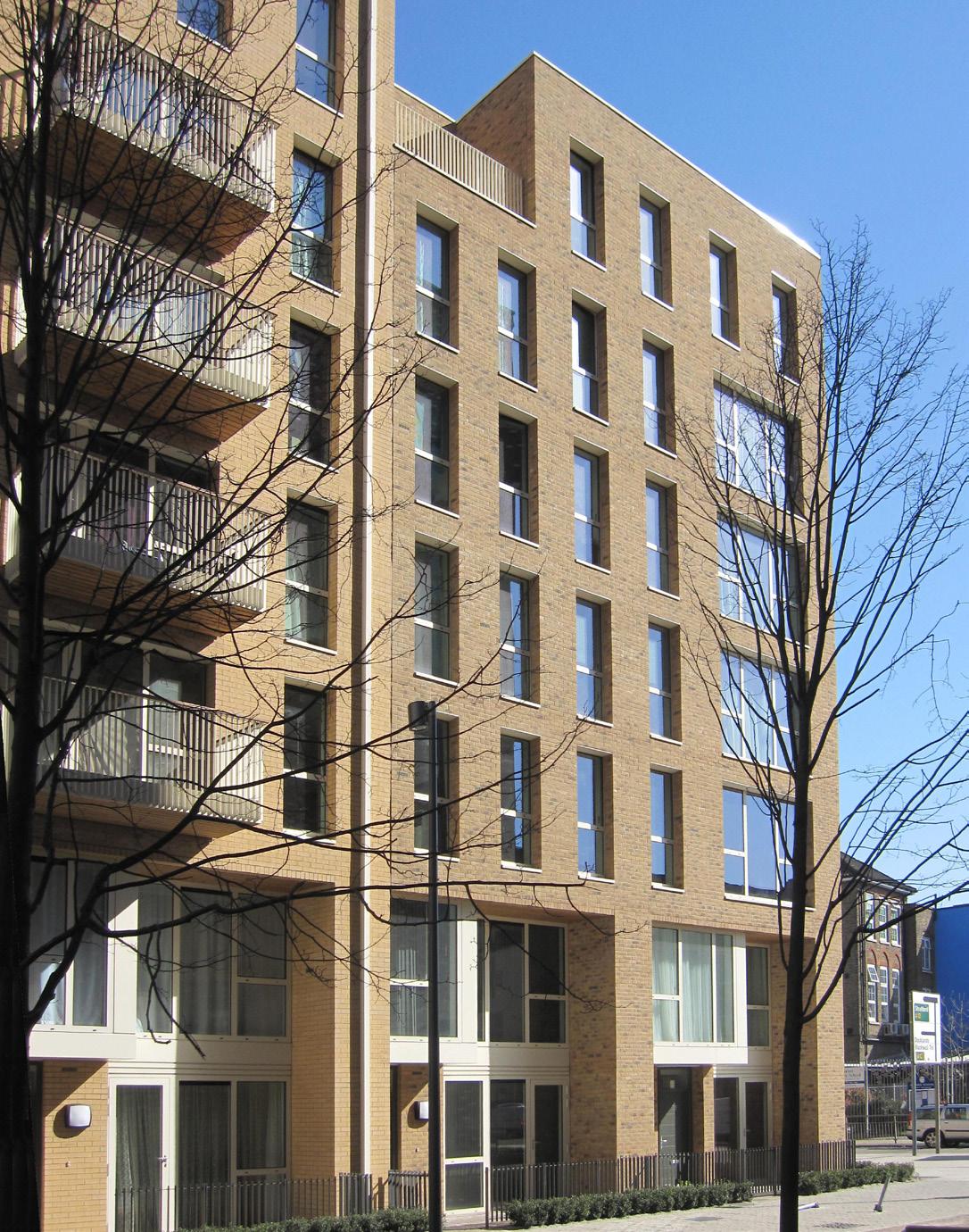 Camden Courtyards, which takes the form of mansion block of between 5 and 7 storeys, achieves a density of 309 DpHa. Two central courtyards, provide many of the flats with a secondary aspect to the busy roads which surround it, and their 18m square dimensions provide the minimum yet adequate separation distances in terms of privacy. The proportions of these courtyards allow for daylight to reach the lower level blocks, whilst landscaped roof gardens provide communal amenity space to residents. Overall, the scheme generally appears to be a good example of a high density urban block.