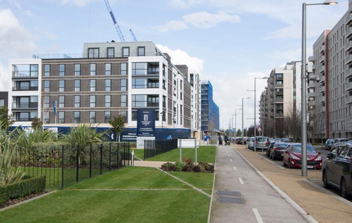 Front doors to homes at street level have a shallow defensible zone, which is largely landscaped with low level planting and shrubbery. North-south streets which run through the blocks are pedestrianised with the exception of access from the north of the site and blue badge parking. These spaces are well landscaped, with green central zones which contain a range of trees, planting and benches, and will receive good amounts of sunlight due to their orientation. A perpendicular linear park terminates these streets to the north. This space has a mix of playspace, planting and seating all of which is well overlooked. The central massing of the urban blocks on this edge all drop to four storeys as to not overshadow these spaces.