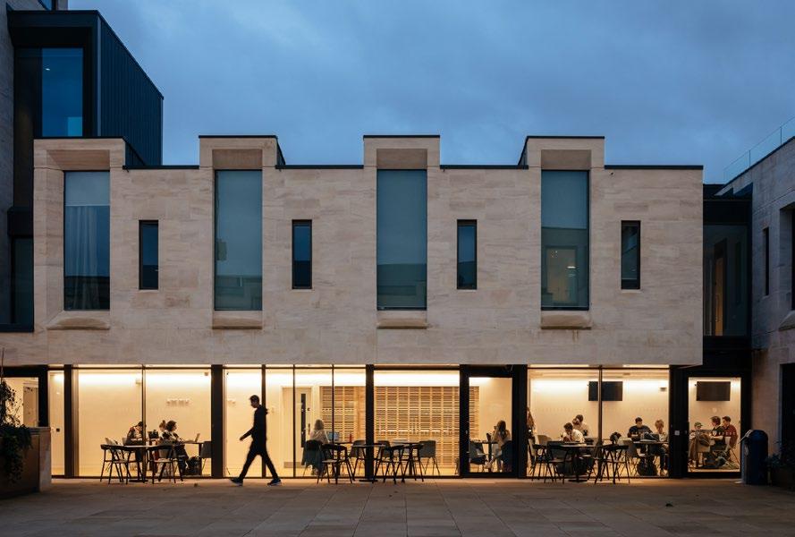 The design of the building takes cues from the existing College architecture and context to provide a striking contemporary design in a sensitive urban context. The original College building material, Clipsham Stone, has been used, and carefully detailed to reference the existing College and provide varied facades responding to different environments. At its heart two unique communal spaces are designed to be seen from the street providing active frontage and a lantern to the space outside the building.