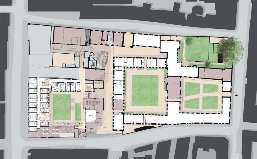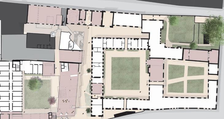 building plot and materiality. This was embedded in the Heritage Statement and the final Design. Via this analytical and sequential approach, we ensured that we understood the restoration of the listed elements and how to respond with the new design to the history and the story of place. The building restoration responded to significance, need, and restoration techniques discussed and agreed with the heritage bodies, whilst the new build reacted to the historic buildings through architectural articulation, materiality, and a new adaptation of the historic language.