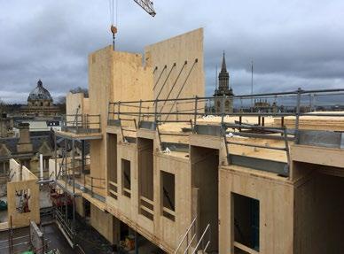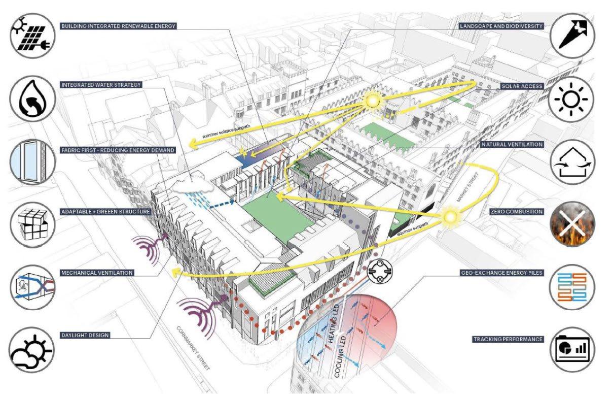 The scheme is central Oxford’s first new all electric building, complemented by on site renewables with a concealed Photovoltaic array and a Ground Source Heat Pumps; these provide 40% of the buildings demand, both successfully navigating Oxfords onerous skyline and archaeological rules. Harnessing embodied carbon the scheme reuses an existing concrete structure, with the majority of new structure being carbon-negative cross laminated timber.