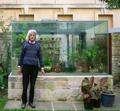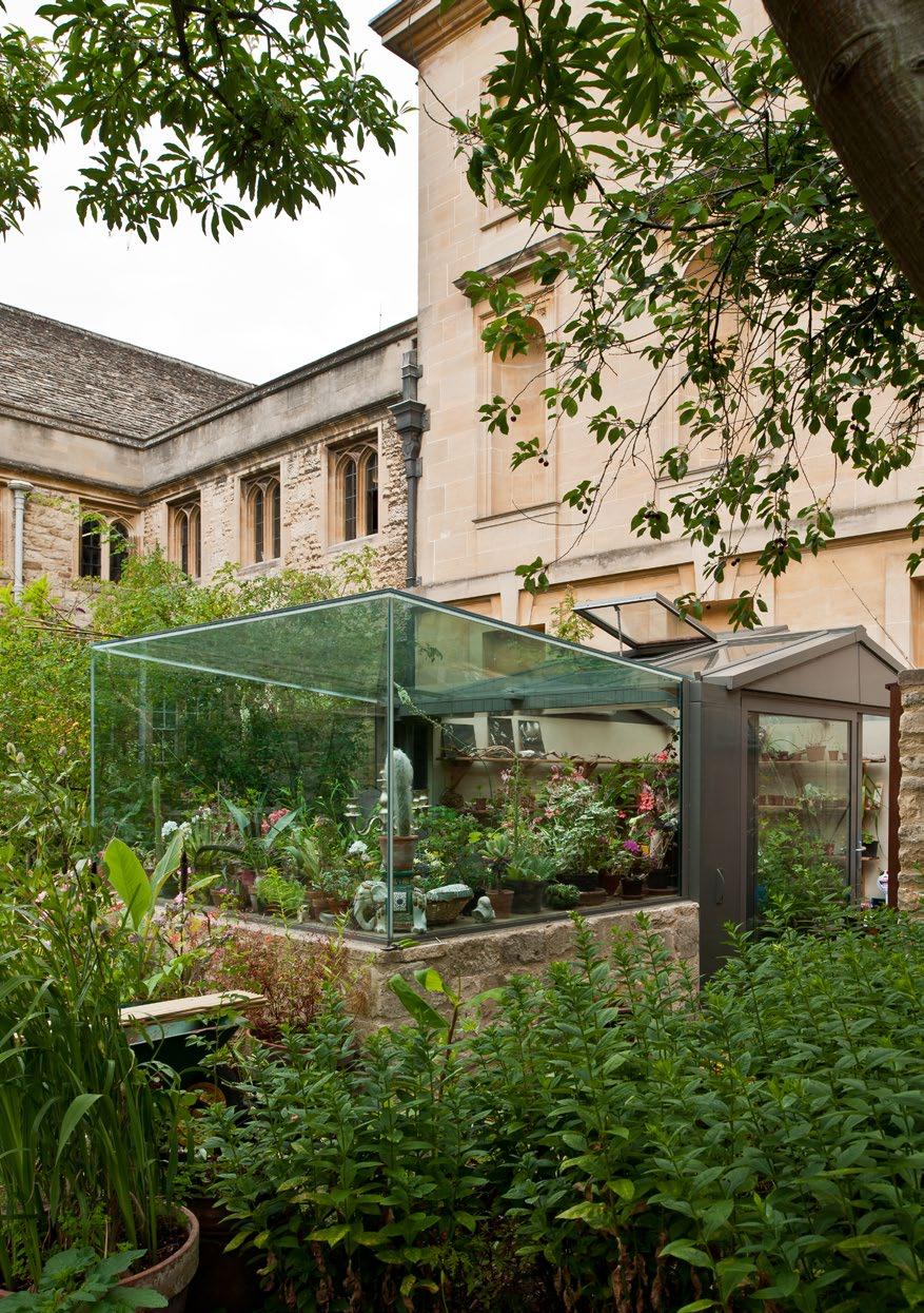 Corpus Christi College, Oxford is famous for its ‘wild’ gardens, which are tended by David Leake, the College Gardener. David’s greenhouse was relocated as part of the proposals, and his vision of a display-case for his work was the inspiration and guiding principle for the new structure. A glass box sits on a stone plinth protruding from an existing stone wall. Pictured below, David cultivates his collection of plants and places objects on display within the college’s Garden Quad.