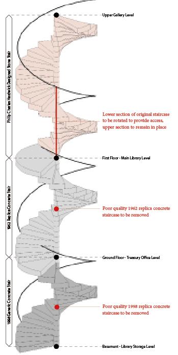 The link connects the existing library to the new extension via the altered stone spiral staircase at Lincoln’s Inn