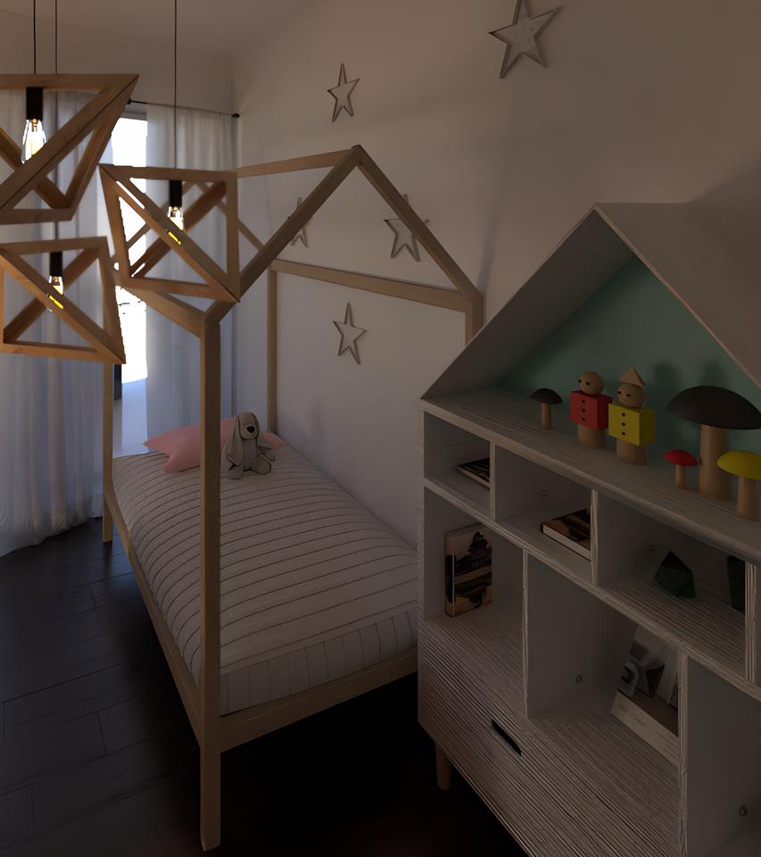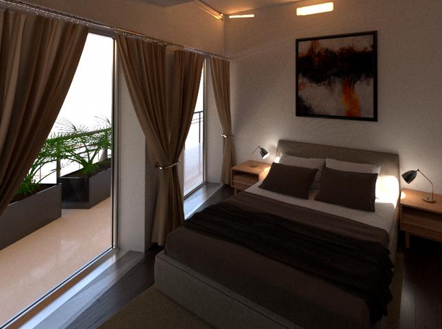 Realizzazione 3D di ripartizione interna e arredo. Ambienti pensati per una giovane coppia. Toni caldi e avvolgenti