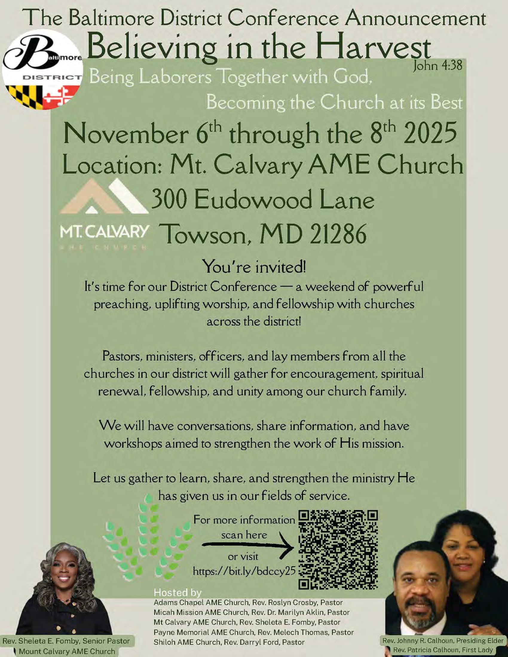 Baltimore District Conference: November 6-8, 2025 at Mount Calvary AME Church, 300 Eudowood Lane, Towson, MD 21286. Opening Worship Service, November 6th at 7 pm.