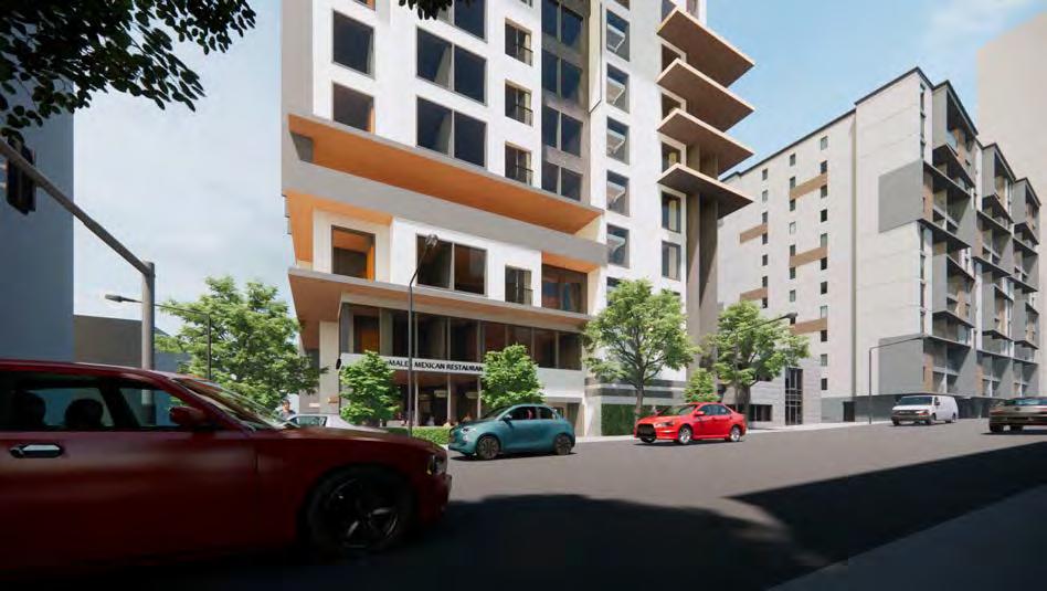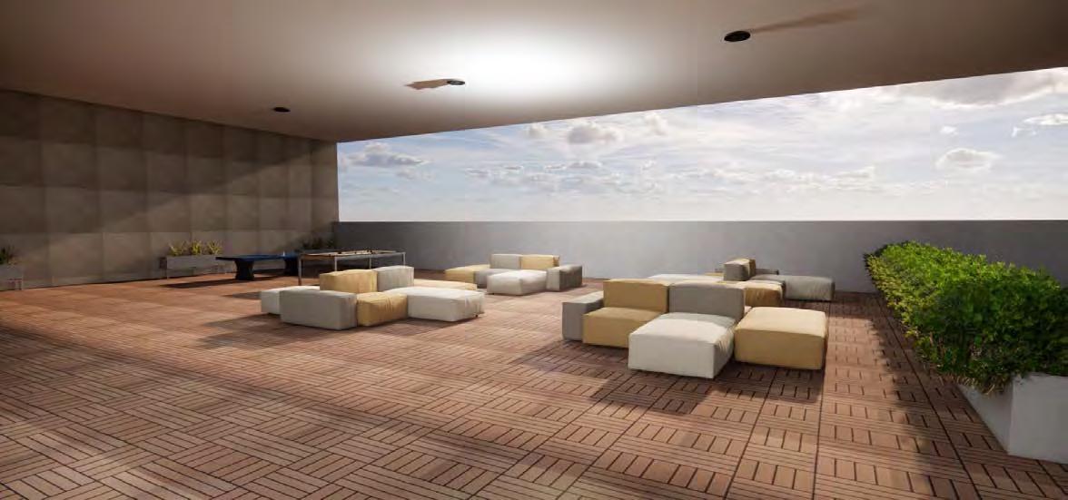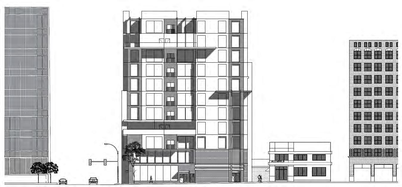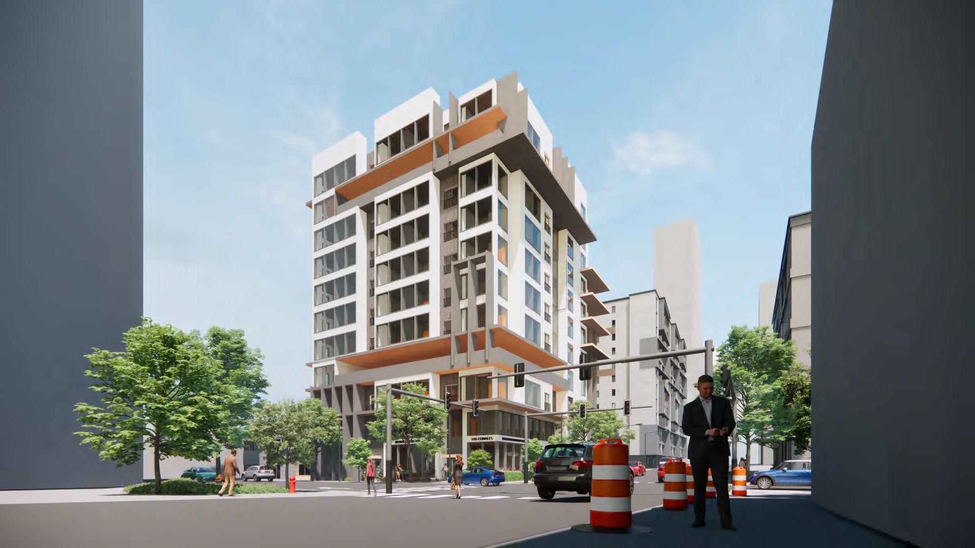 It is eleven stories tall and features apartments ranging from studios to two-bedrooms, outdoor communal spaces, and recreational areas.
