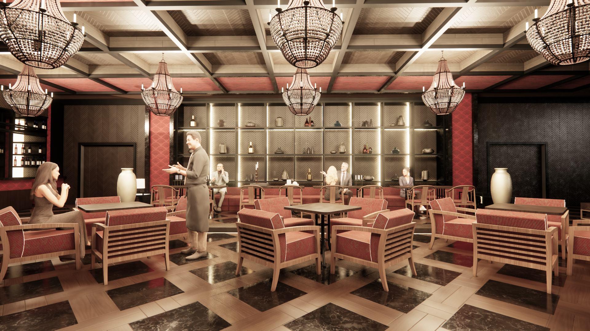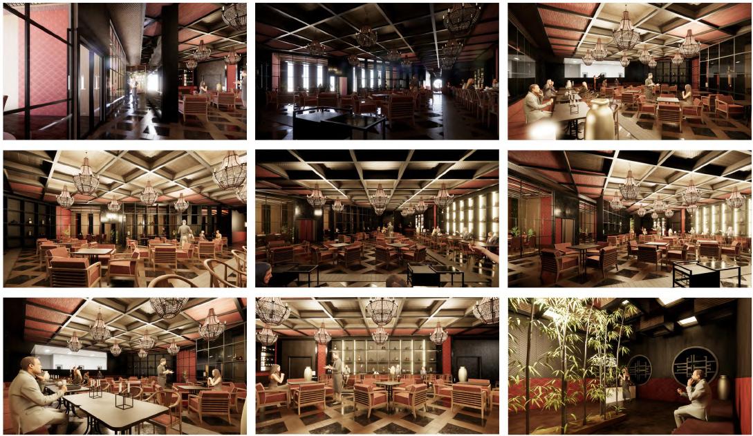Restoran yang berada pada bagian tengah bangunan ini memiliki desain yang mengikuti konsep dari Ballroom yang luxury agar pengunjung merasa nyaman dan menikmati restoran ini.