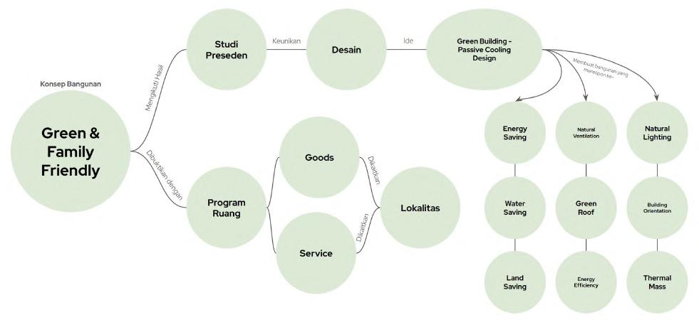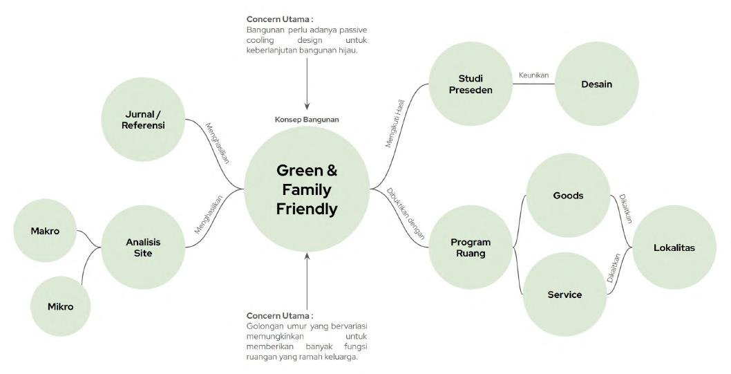 Konsep akhir bangunan yang dirancang adalah "Green & Family Friendly," yang didasarkan pada hasil studi mendalam, baik melalui studi preseden maupun analisis site. Konsep ini diperkuat dengan program ruang yang dirancang untuk mencerminkan kebutuhan dan karakteristik lingkungan. Studi preseden dilakukan dengan mengambil elemen-elemen unik dari bangunan referensi, kemudian dihubungkan dengan ide green building, khususnya pada desain pendinginan pasif (passive cooling design), yang terbagi ke dalam berbagai variabel. Setiap variabel ini diadaptasi untuk menciptakan lingkungan yang ramah lingkungan, efisien secara energi, dan nyaman untuk keluarga. Program ruang yang dikembangkan menunjukkan proses desain yang memunculkan konsep lokalitas, dengan mempertimbangkan konteks budaya dan geografis yang ada, sehingga tercipta sebuah bangunan yang tidak hanya ramah lingkungan tetapi juga sesuai dengan kebutuhan lokal dan keluarga.