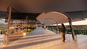 Bagian eksterior terdapat area duduk untuk pengunjung bersantai, serta ada walking track yang merupakan jalan eksisting dari Batavia Cove.
