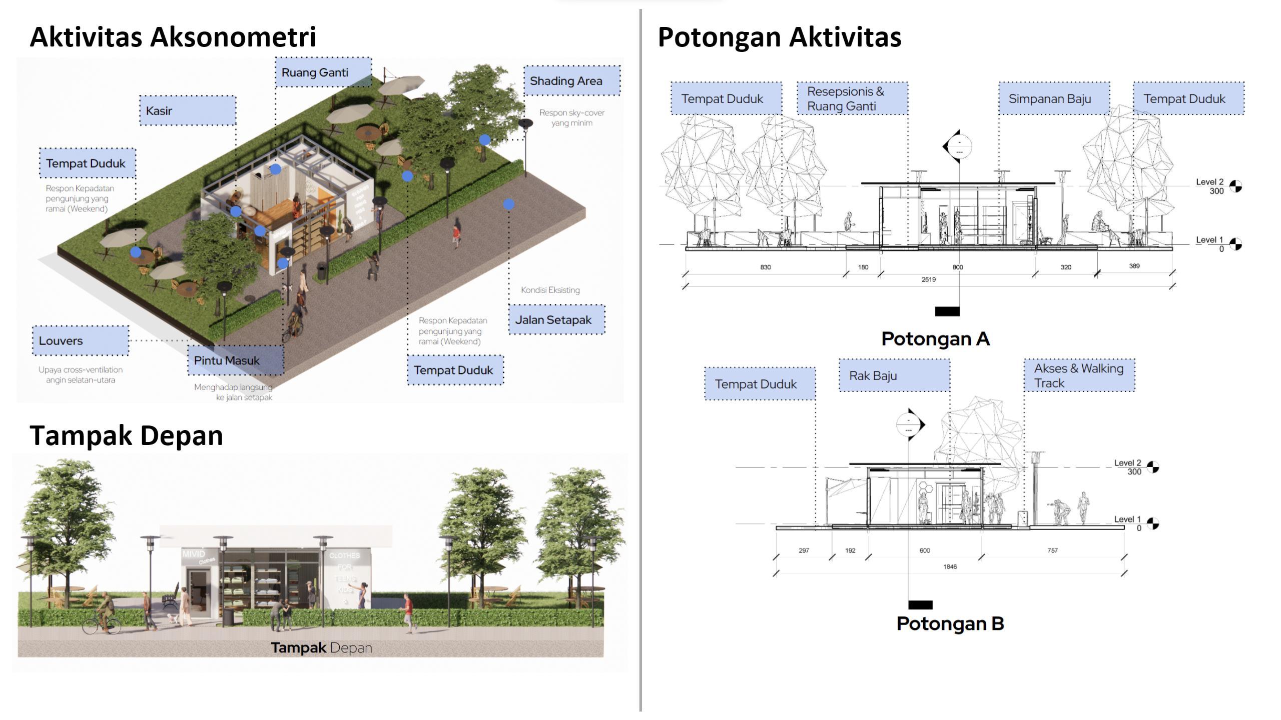 Aktivitas interior dan eksterior yang saling berhubungan satu sama lain memberikan kenyamanan bagi pengunjung maupun penjual, yang dimana