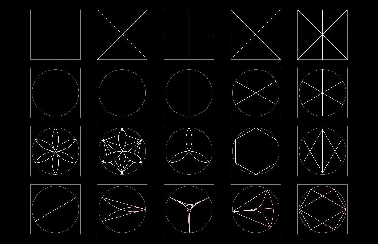 Strips of wood, measured in inches, were tested to determine the optimal length for each segment of the tectonic system. The initial tectonic component was comprised of 2 plywood strips, each measuring ¾” in width and 30” in length. Through form-finding, bendable and resilient shapes numbered 1 to 5 were created. Shape 3 was selected as the strongest shape that can be used in the final design.