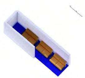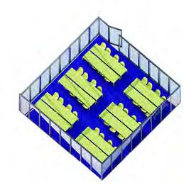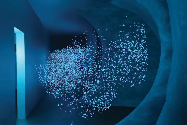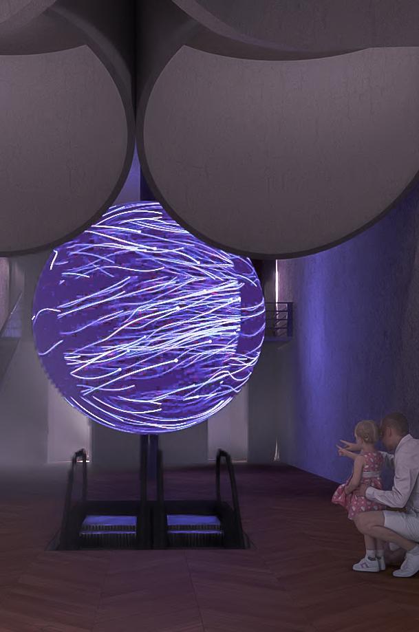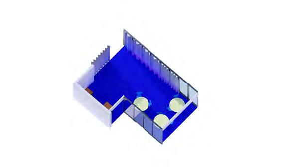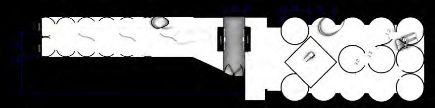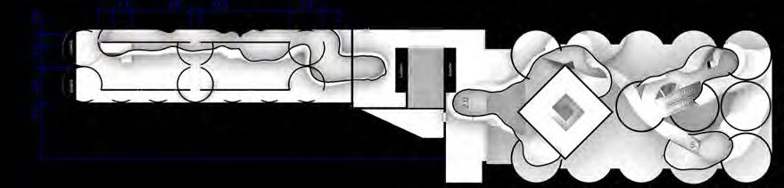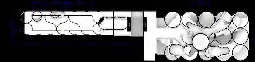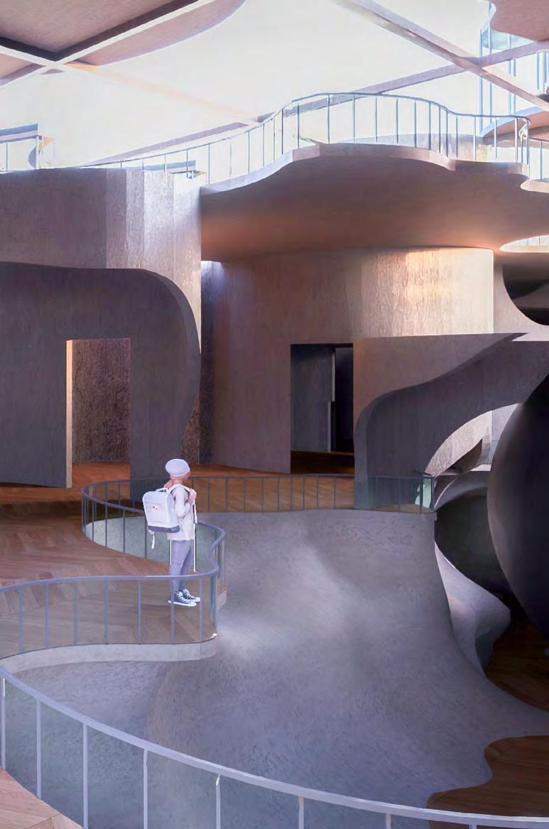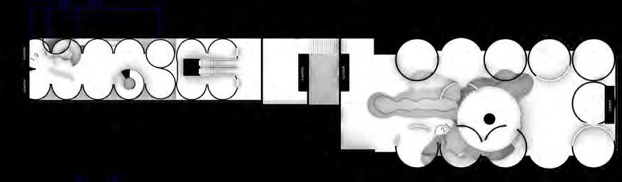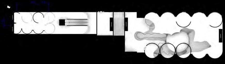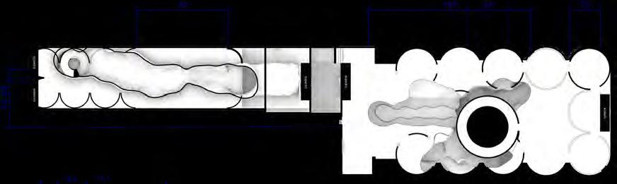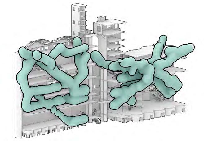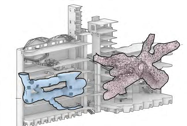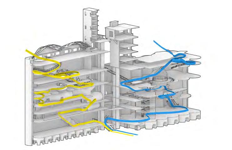 In the northern building, the particle pathways are interpreted as circulation pathways, while in the south, the particles are used as rough contour lines to create 3-dimensional rooms. The original silos act as traversable spaces or defining walls.