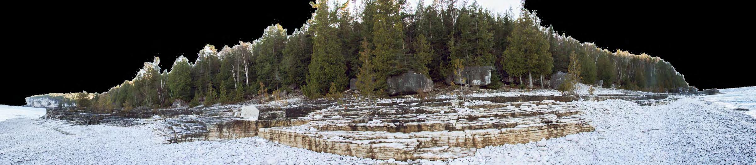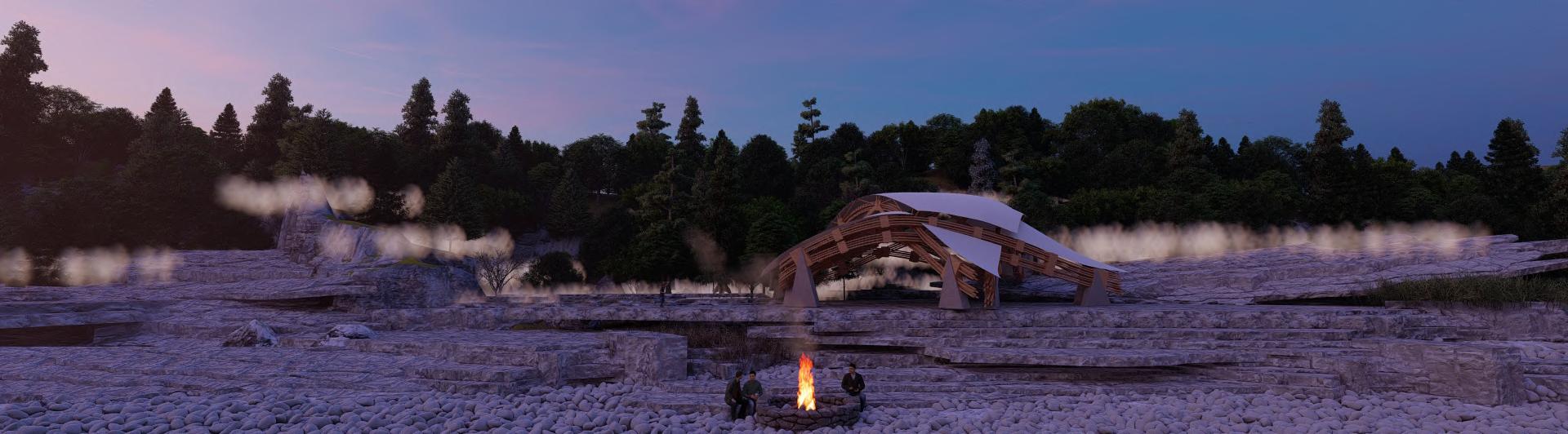 The selected site is the Storm Haven Backcountry camping ground, part of the Bruce Peninsula National Park. The site features rugged cliffs and terrain that are part of the Niagara Escarpment. The proposed design aims to enhance the hiking experience through rocky trails by creating an organic curvilinear resting area. This building, whether covered or open, allows for multifunctional use throughout the year.