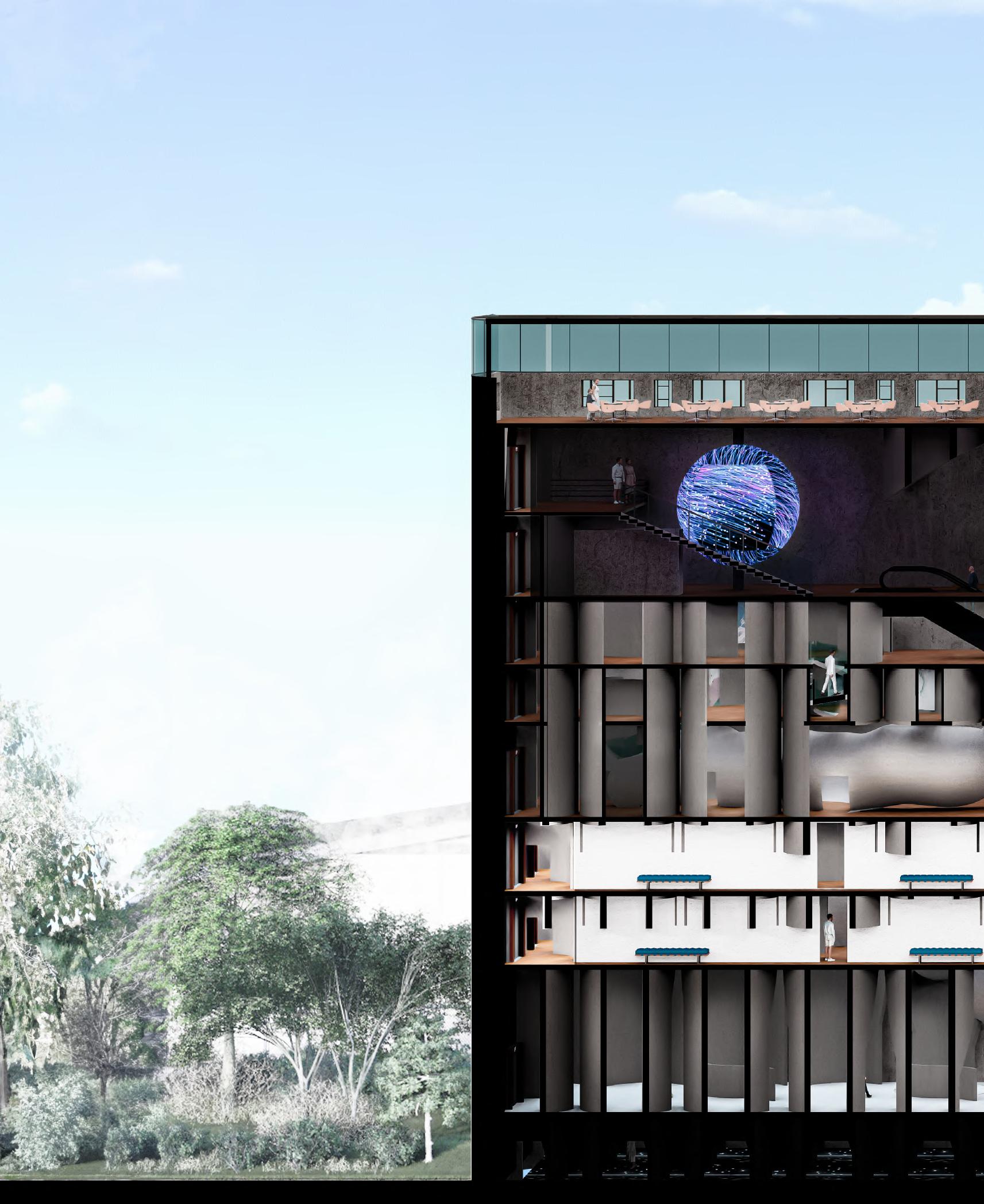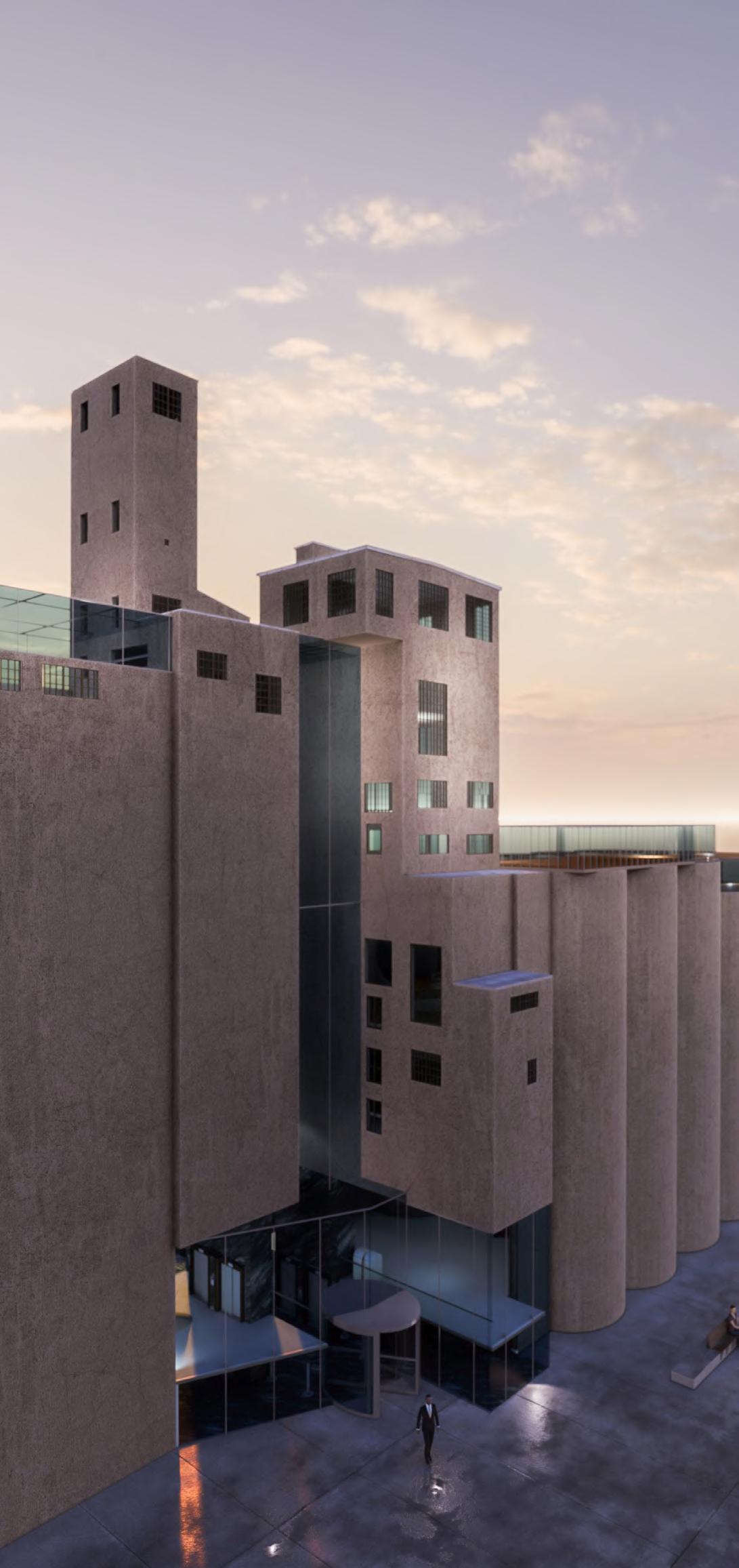 The proposed building is composed of two interconnected silos with a glass atrium. The northern building has 10 floors, while the southern one has 8. The upper floors house brighter gallery spaces, a rooftop garden, and a restaurant. The original silo facade remains preserved.