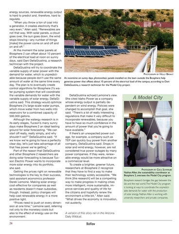 Biosphere research bridges the gap between the lab and the real world. The Model City program is looking at ways to coordinate the unpredictable demands for water with the production of solar ener gy. Nathan Allen is working with university researchers and private companies.