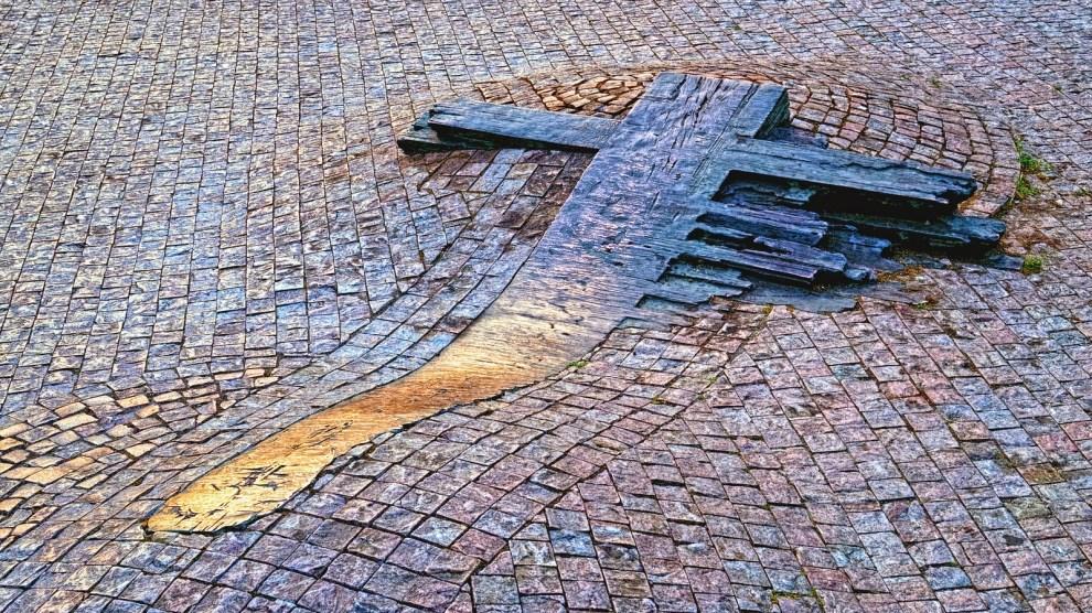 iżda l-monument ta’ Jan Palach qiegħed mal-art fuq qiegħ immewweġ b’salib ħdejn ismu. Forsi għax parti minn ġismu spiċċat imħallta mal-asfalt ta’ taħtha.