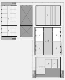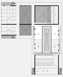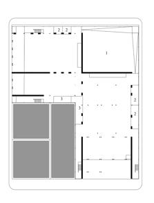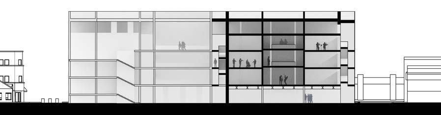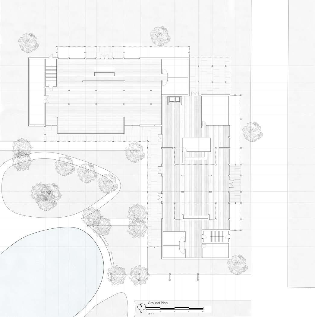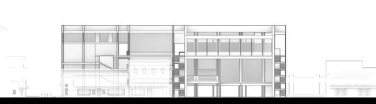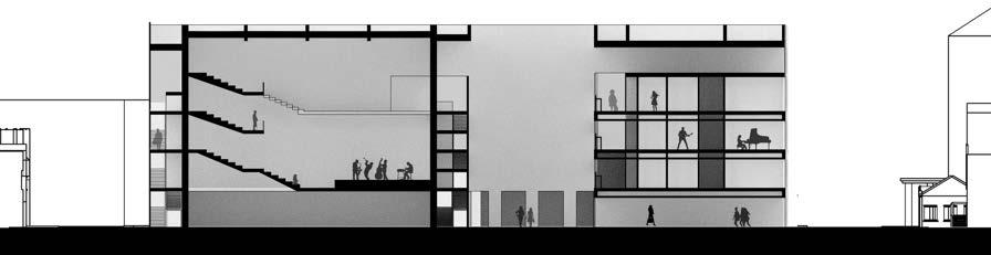 The building is anchored by the main preformance space as the walls of the space extend the length of the building defining the major zones of the project. The ground floor’s open design is made possible by pushing all the required spaces along the sides of the building. This is opposite from the other floors where the required spaces are centered and the circulation is along the sides.