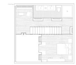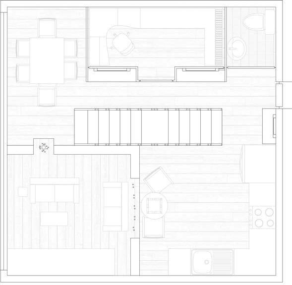 The building is separated into two parts: the Northern wing of the ground floor is a restaurant, providing a softer entrance into the building and park for both residents and visitors. The eastern wing of the ground floor is the main entrance for residences. The building holds the edge of the road and has multiple entry points to make the building more welcoming. The upper floors are the apartments with a primary duplex design with prototypes to allow for slight variations in duplex size and how many rooms they have.