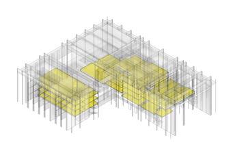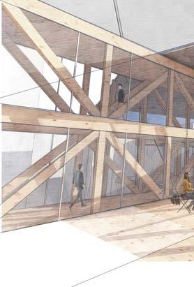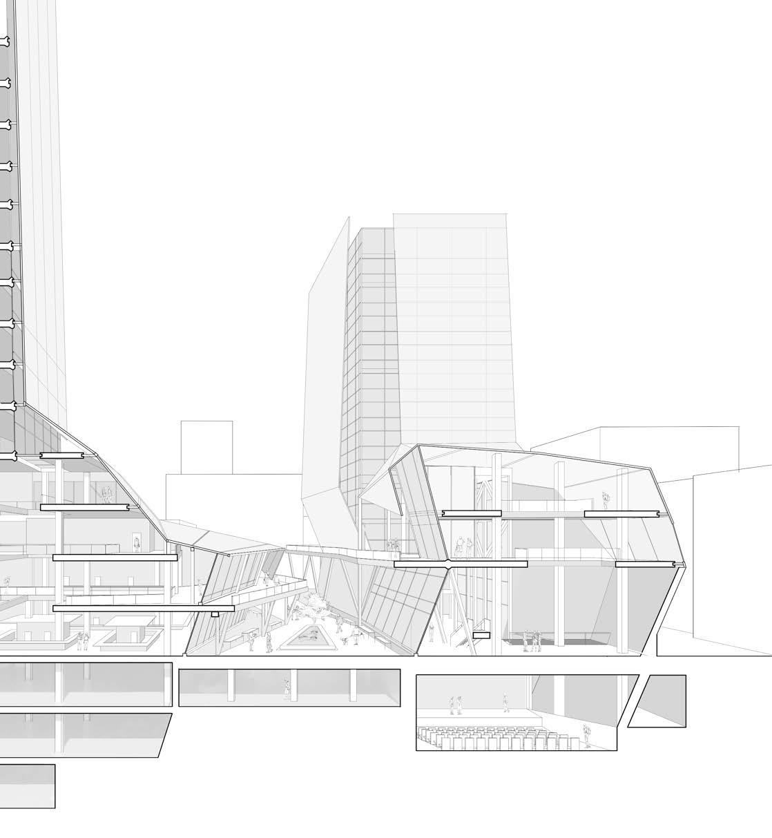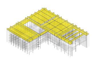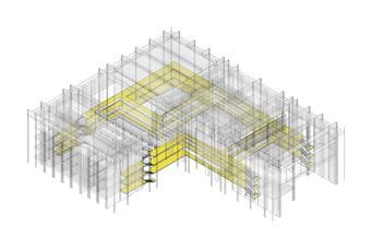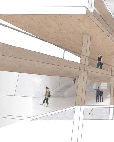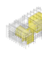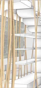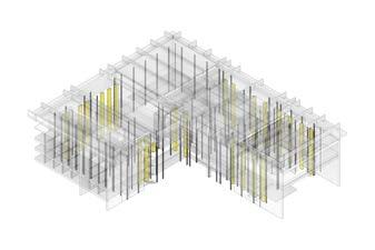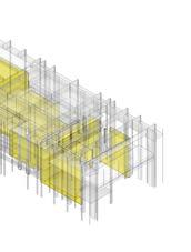 The roof of the building is modular in its design as it uses columns that extend down from the roof to create zones of spaces. These spaces are where the programs are placed creating a core system that has the circulation move around them.