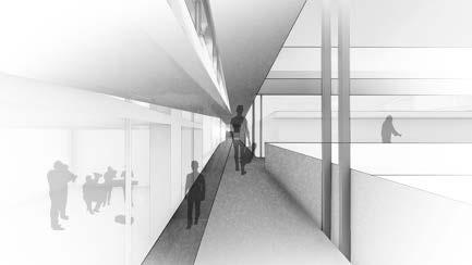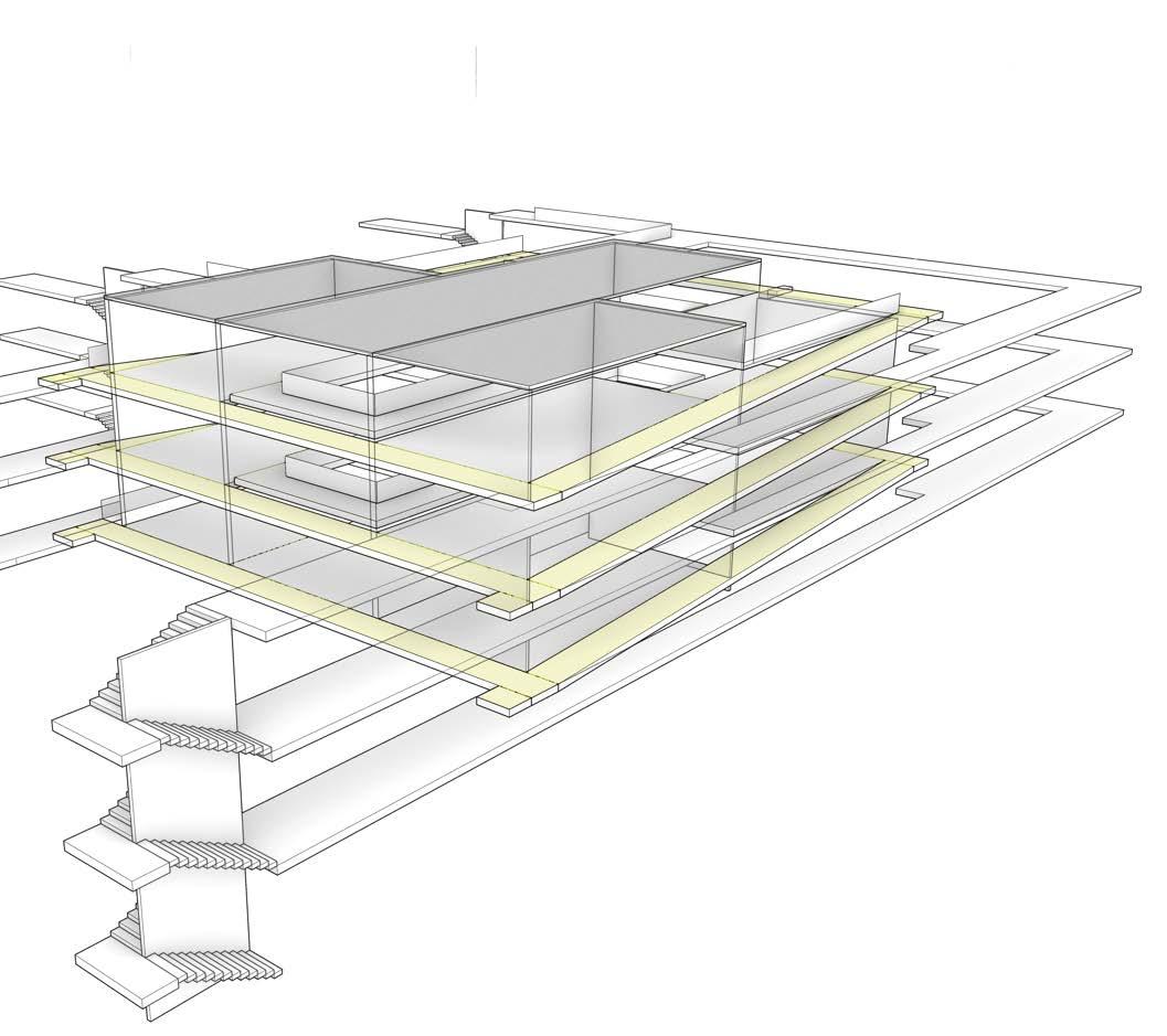 The circulation of the building as mentioned previously, moves along the sides of the building allowing for access to the spaces in the center. To allow for the offset floors, there is a ramp that rotates around the central core and allows for access to all spaces in the building.
