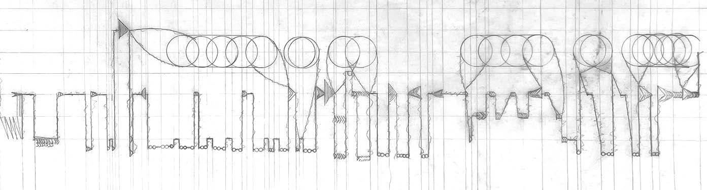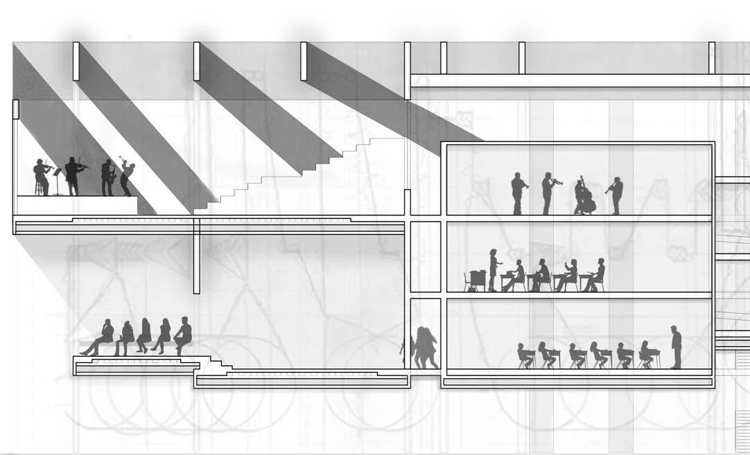 For this project, my task was to create a satellite music school in downtown Gainesville. This design was influenced by my musical notation of the song Little Black Book by Jlin played by the Kronos Quartet. The main takeaway from the song was the the idea of tension and how it can be used as a system to define the spaces in the building.
