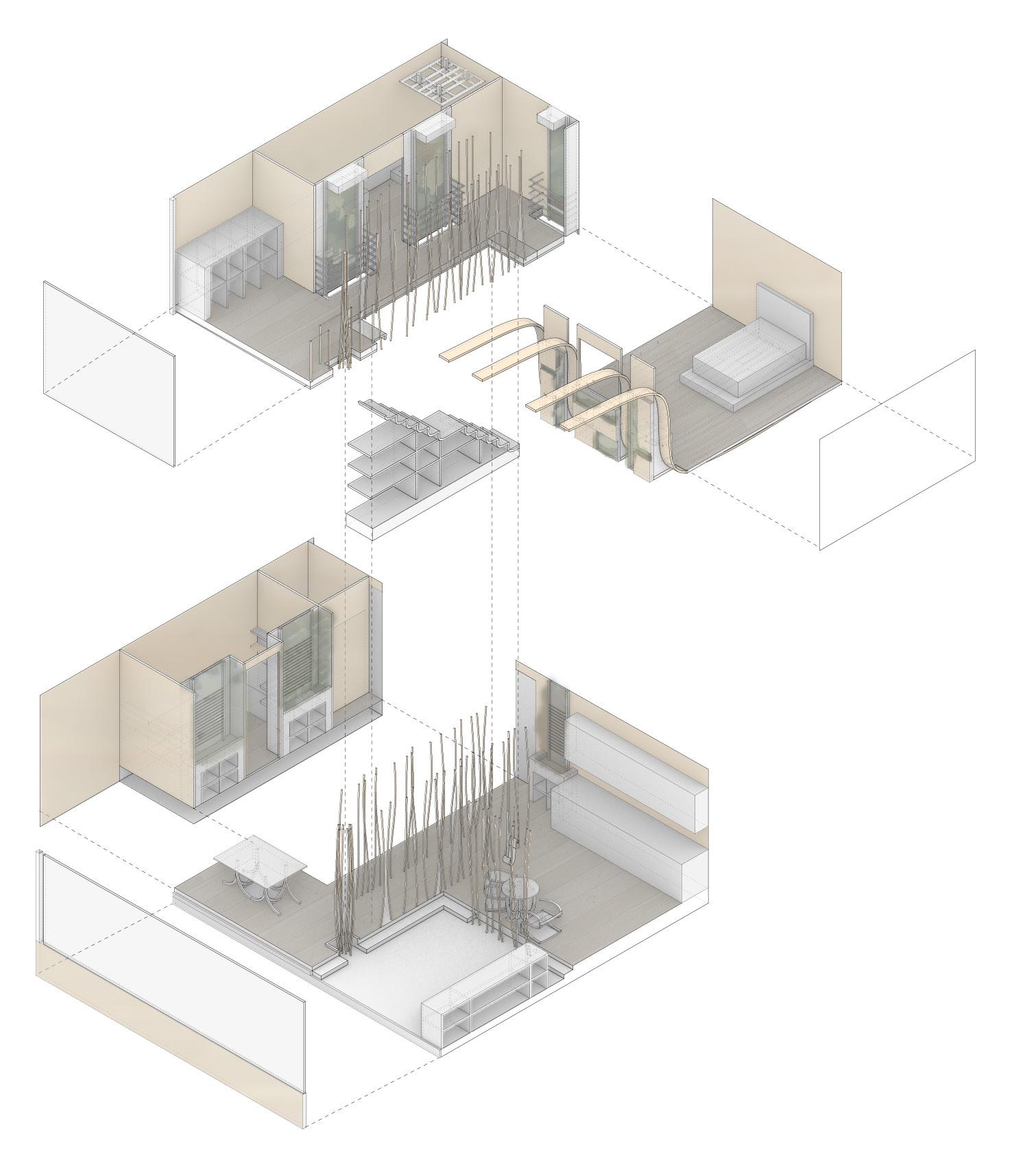 the design emulates an estuary. The furniture mirrors the found in such environments, while the apartment’s columns remangrove roots. Every part of the apartment works together.