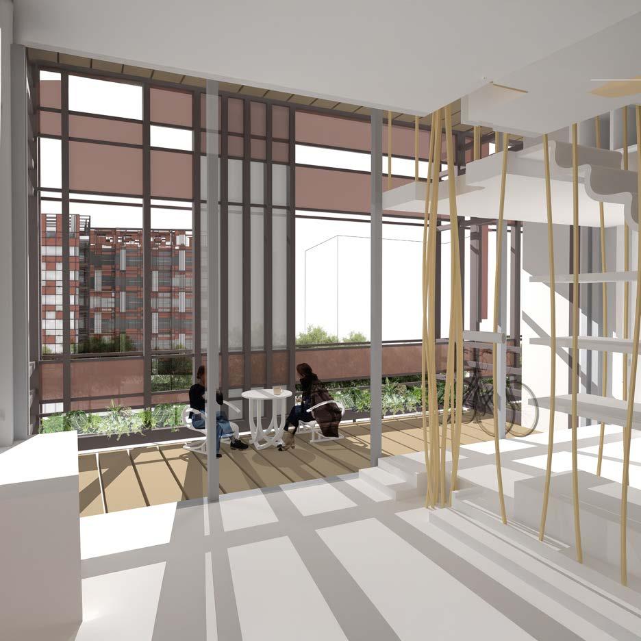 The balcony serves as a key feature of each apartment, offering residents an unobstructed view of the interior park nestled within the neighborhood. This design creates a seamless visual connection to the greenery, fostering a sense of openness and tranquility in the urban setting. A large semi-opaque wall partially encloses the balcony, carefully balancing privacy, and exposure. This wall shields the space from harsh weather conditions, such as strong winds or direct sunlight, ensuring the balcony remains a comfortable and functional area throughout all seasons. The integration of natural elements into the design is a central theme of the project. In dense urban environments, where access to nature is often limited, this connection to greenery becomes essential for enhancing mental well-being, promoting sustainability, and cultivating a sense of harmony within the living space.