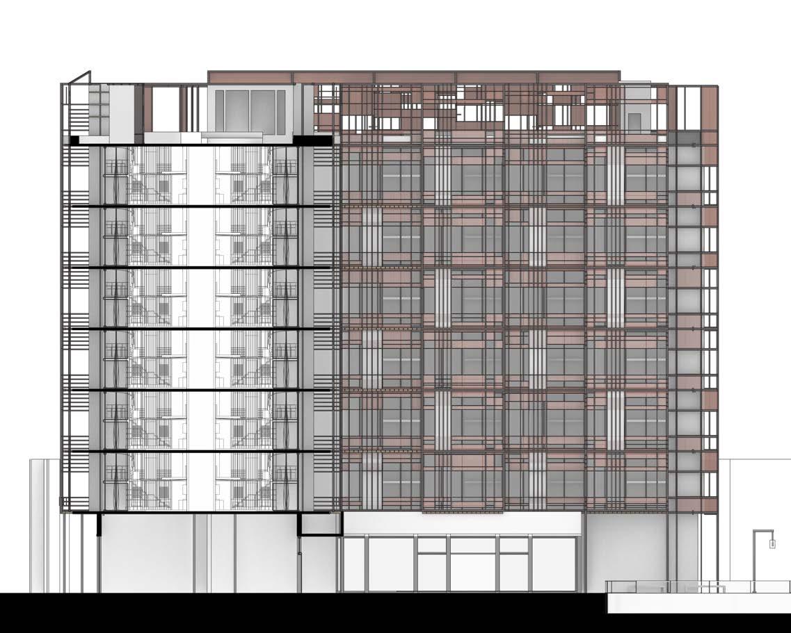 The building rises six floors, each composed of duplex apartments designed to optimize space and functionality for urban living. The façade is a distinctive steel grid spread with slightly opaque glass panels, creating a dynamic play of light and shadow throughout the day. This design not only enhances the building’s aesthetic appeal but also provides varying levels of privacy and lighting for the apartments. The panels are strategically configured to shift subtly, introducing a sense of individuality to each unit and ensuring no two apartments are identical in appearance. The façade shifts two feet back and forth, generating depth and texture while defining private terraces for residents. Within this two-foot recess, the design incorporates versatile storage spaces, such as planters for greenery, bicycle racks, or additional shelving. This multifunctional approach maximizes utility while maintaining a clean, cohesive design, contributing to the building’s innovative and resident-centered identity.