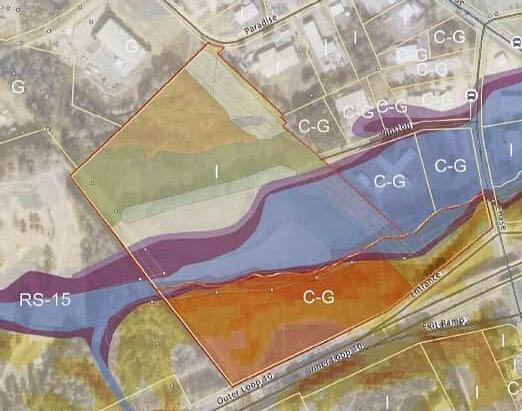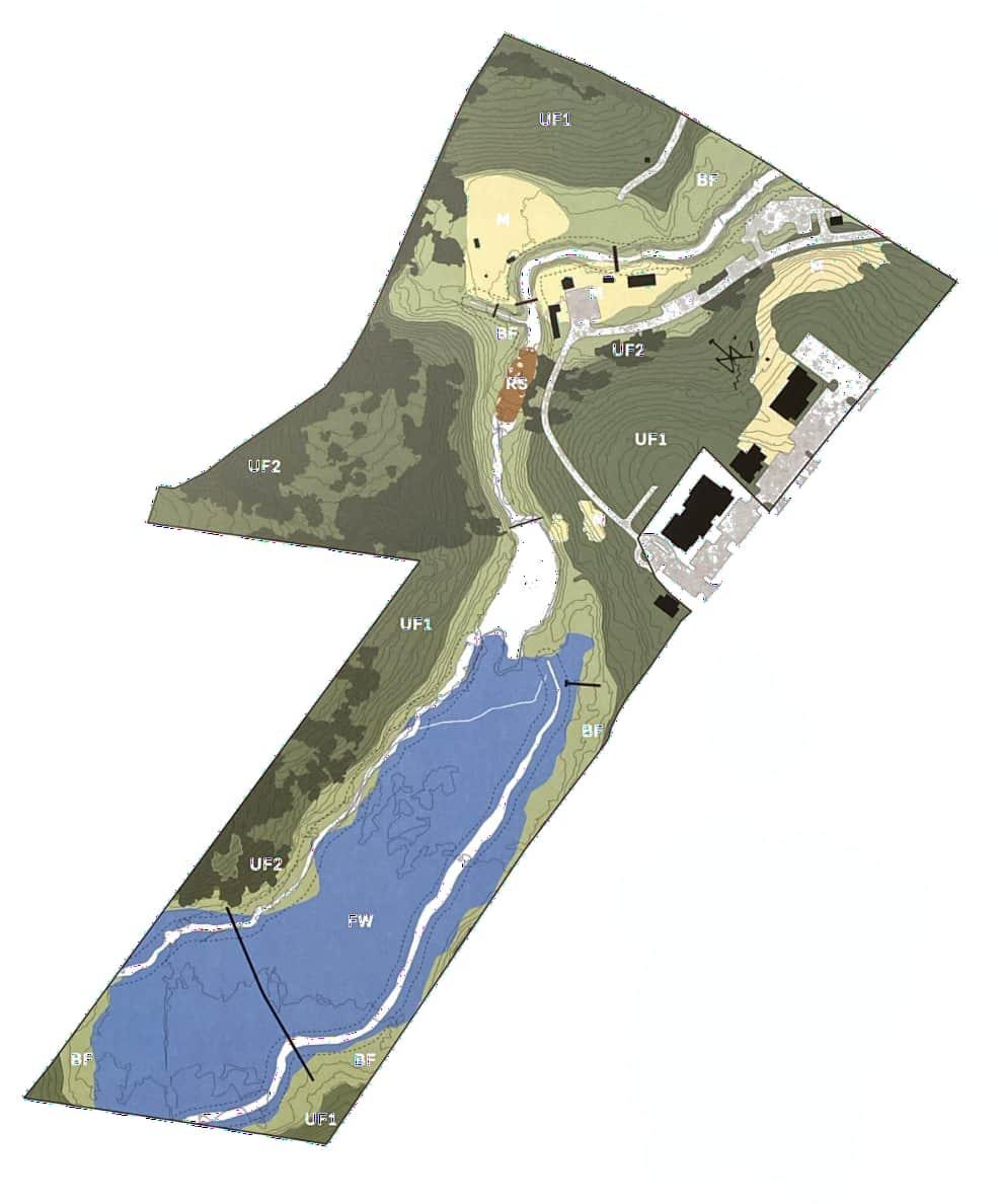 Featuring slope, floodplain regions, zoning, property borders, and different ecosystems located within the site boundary.
