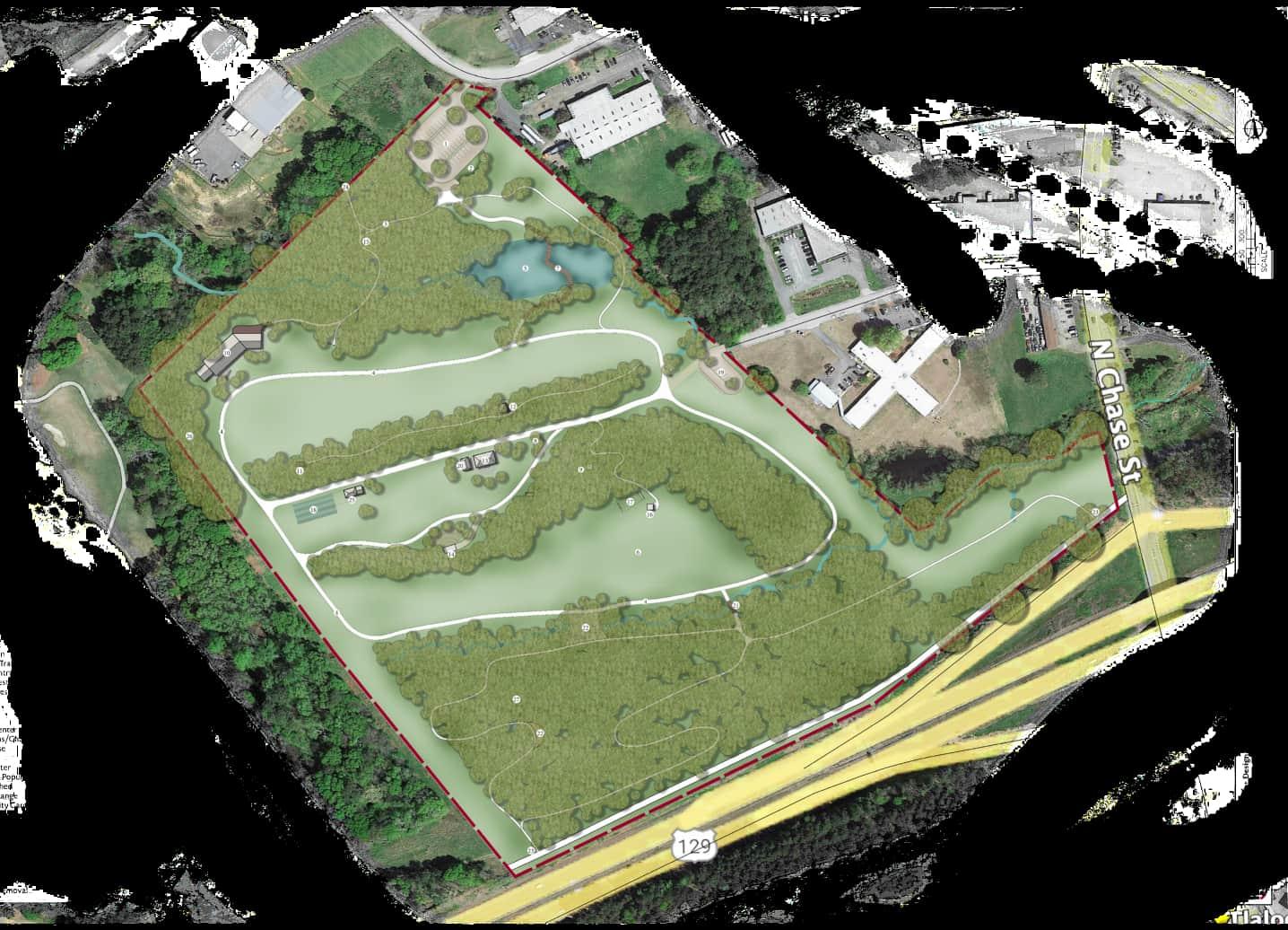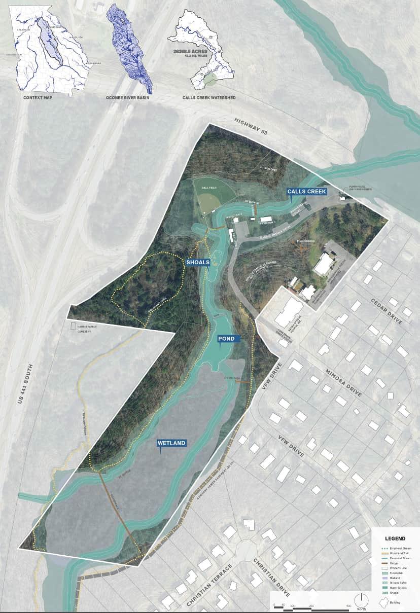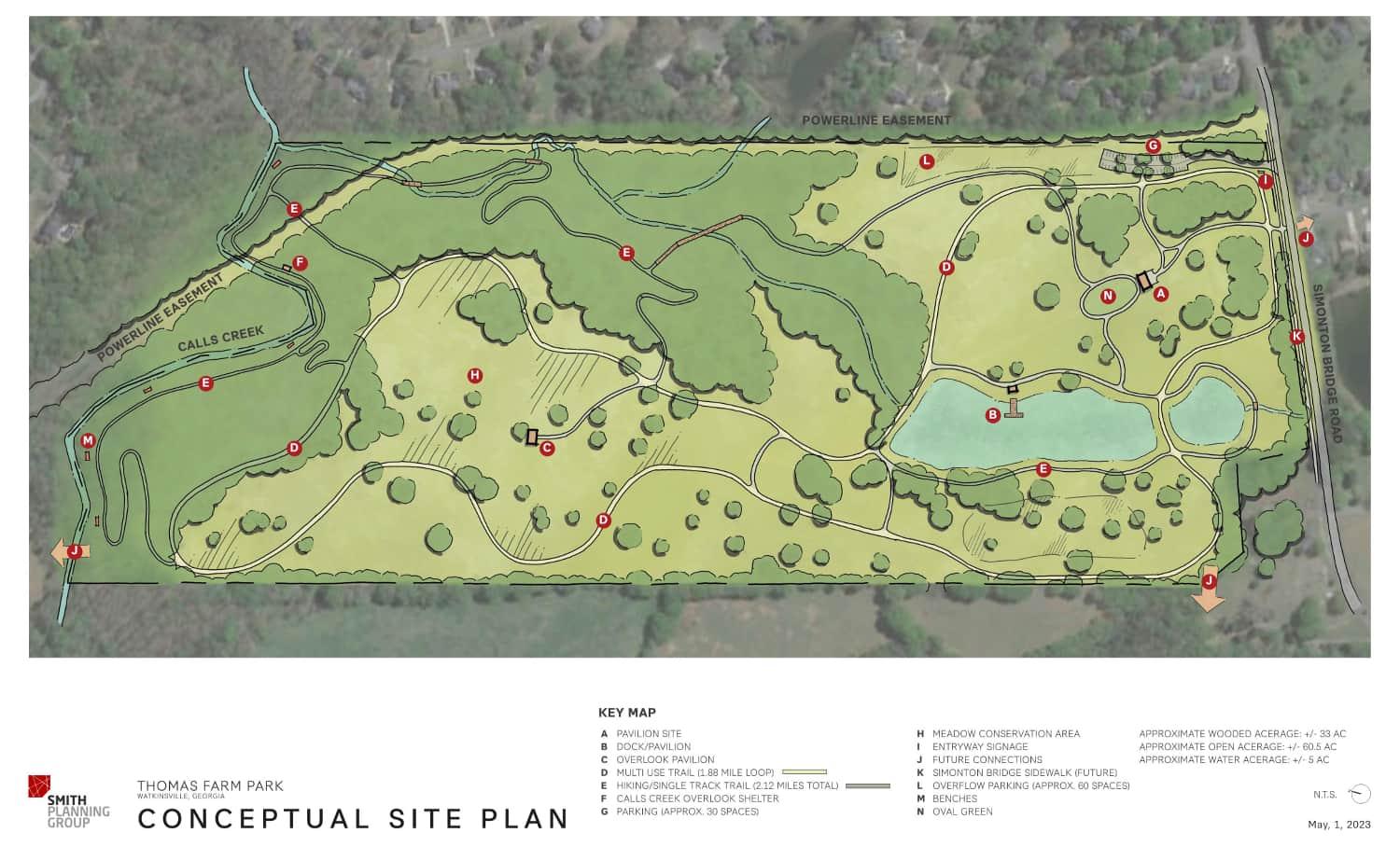 Working very closely with the mayor of Watkinsville, we envisioned the park to serve as a nature preserve where people can observe the natural beauty this property had to offer. Some major elements we wanted to include were a measured running path, walking trails, plenty of parking, pavilions equipped with water fountains and bathrooms and some nodes along the border of Calls Creek. After months of design, the park went public to the city in the Spring of 2023.