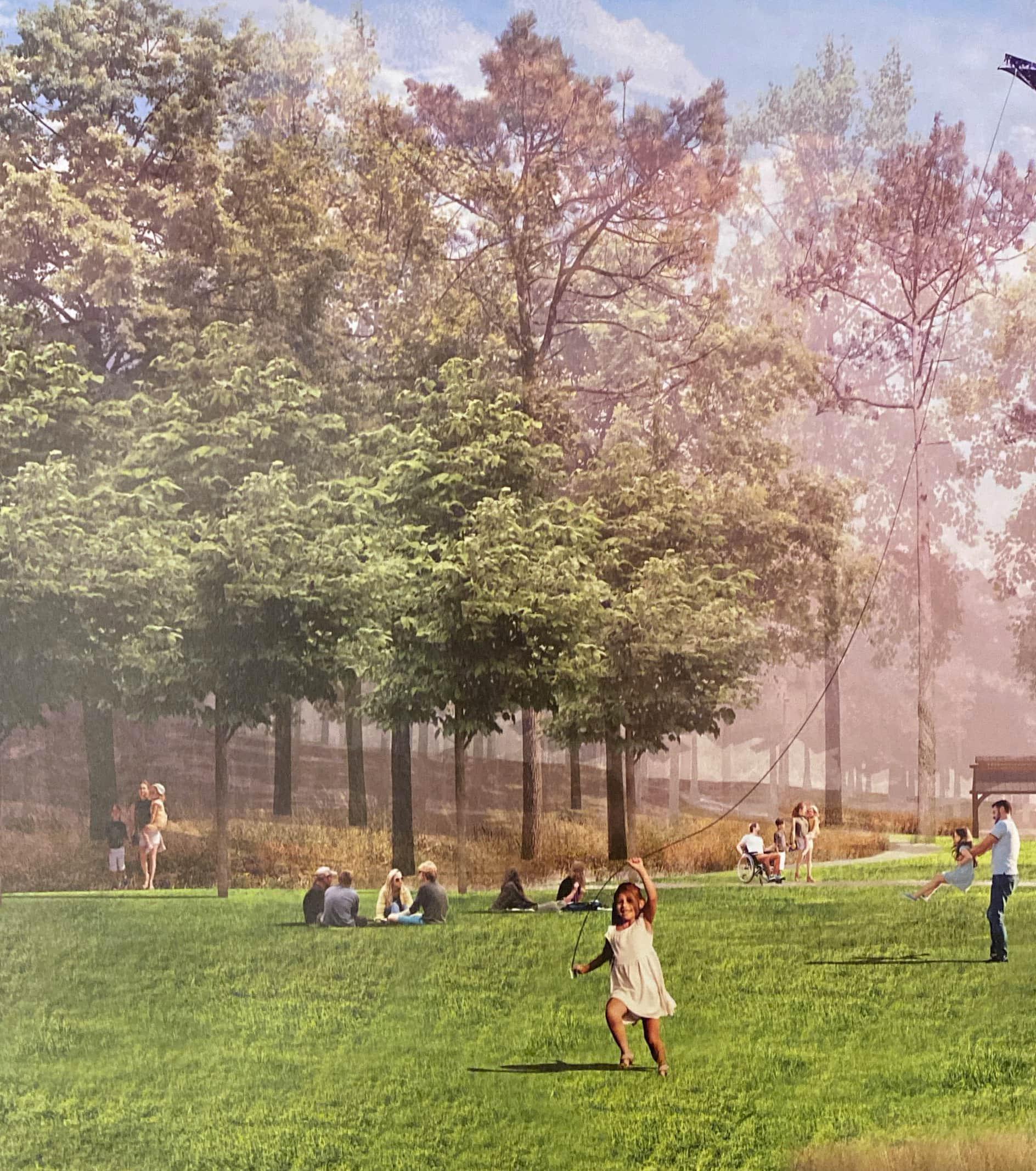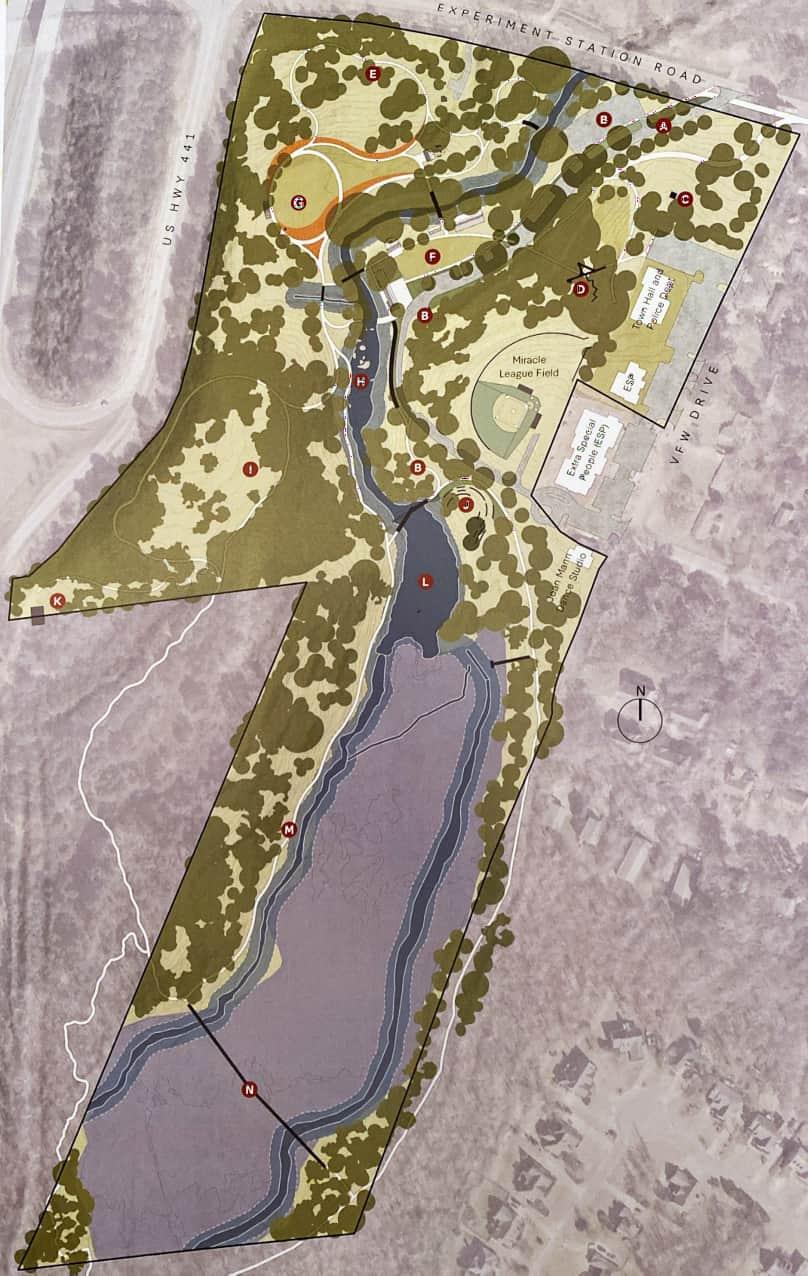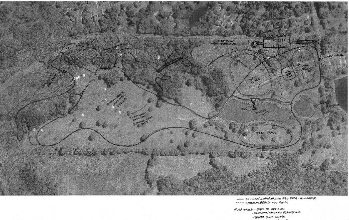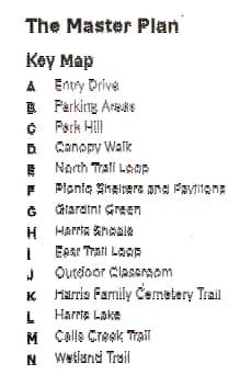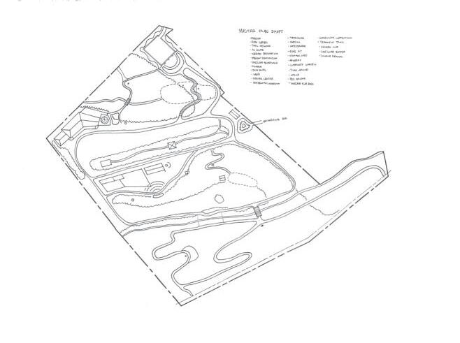 First rendition of the master plan, featuring trails, pavilions, gardens, boardwalks, parking, etc...