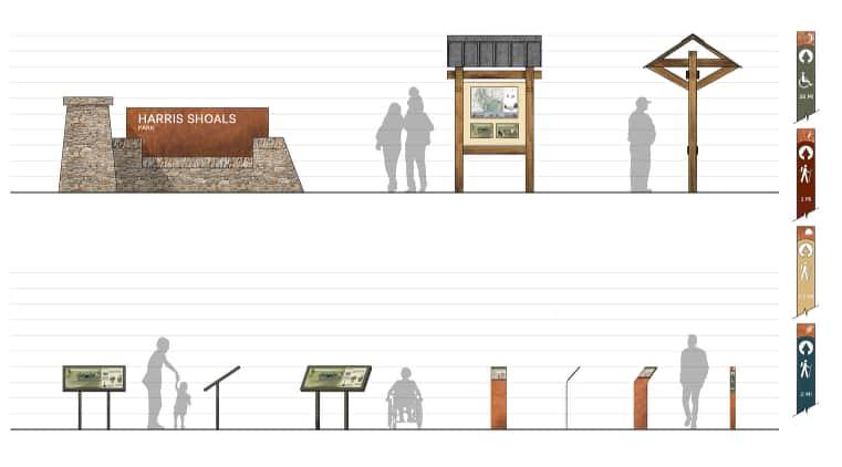 Interpretive signage, trail map kiosks, trail markers, entrance signage designed for the park.