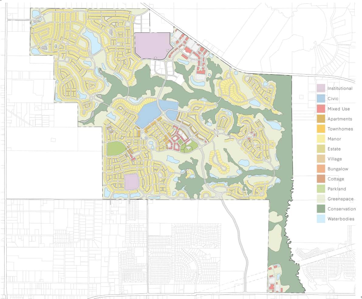 A land use diagram displaying the development makeup of the site. With several streams running throughout the site, much of the low lying interior is planned to make up a conservation easement.