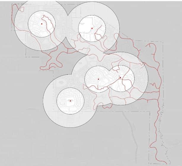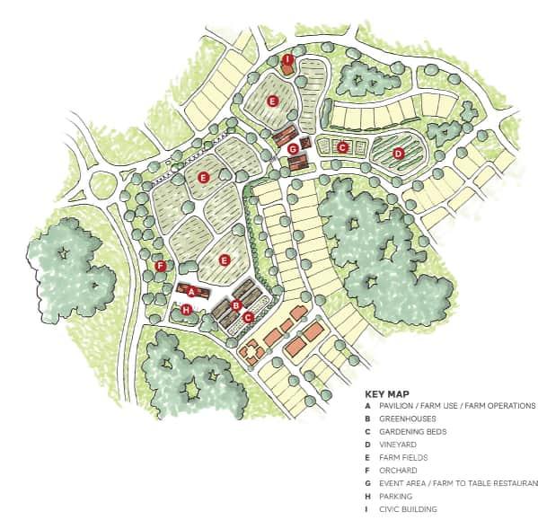 As our overall master plan for this site was so large, enlargements were made in order to effectively communicate certain details. The Jubilee Farm is a community garden intended to serve those who live inside the development, created using a combination of hand rendering with procreate. The roundabout enlargement was created using AutoCad linework, rendered with procreate.