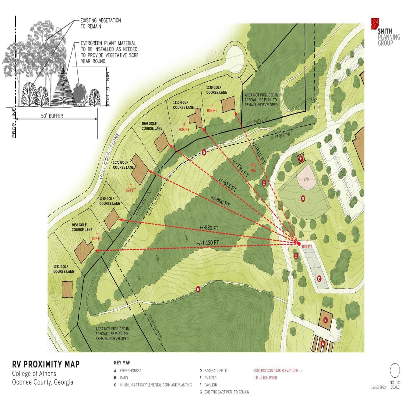 One concern for this site was its proximity to a neighboring subdivision. To ease the minds of concerned neighbors, a buffer exhibit was made for presentation to the adjacent property owners. It was important for this exhibit to outline the site’s topography, existing buffers and planned berm and buffer plantings.