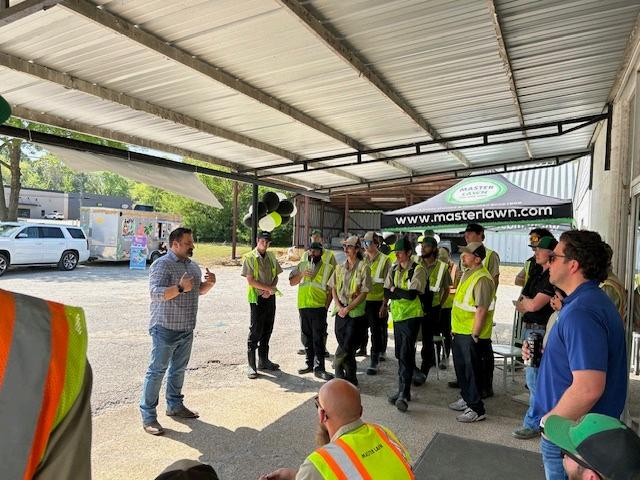 Lawn Care GM Chris Bruno left addresses the Master Lawn team at their 2025 Spring Kickoff