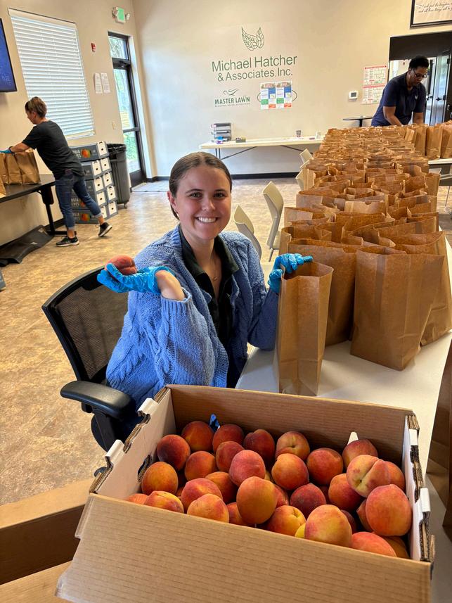 When the Georgia Peach Connection made its rounds through Mississippi, one of its stops was at The Landscape Center on June 20 Tiffany Burse far left bags peaches for Memphis Branch and Master Lawn employees.