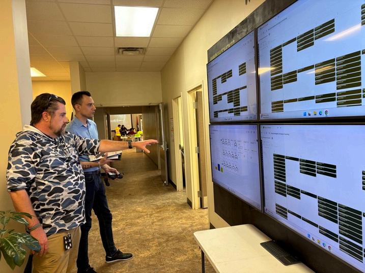 Commercial Maintenance Senior Operations Manager Will Comstock, left, and Jacob Waltz, CEO of Intraframe, discuss the bank of monitors that will allow for visibility of construction and maintenance schedules in real time.