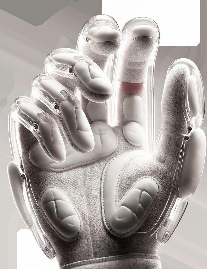 ƎA detailed close-up of a translucent glove with large white padded sections on the fingers The glove is crafted from a futuristic, semi-transparent material, allowing a faint view of the hand beneath The white pads are thick, cushioned, and designed for extra protection The design is sleek and modern, with a high-tech aesthetic The background is minimalistic with soft lighting to emphasize the glove's unique textures and contours Ɛ