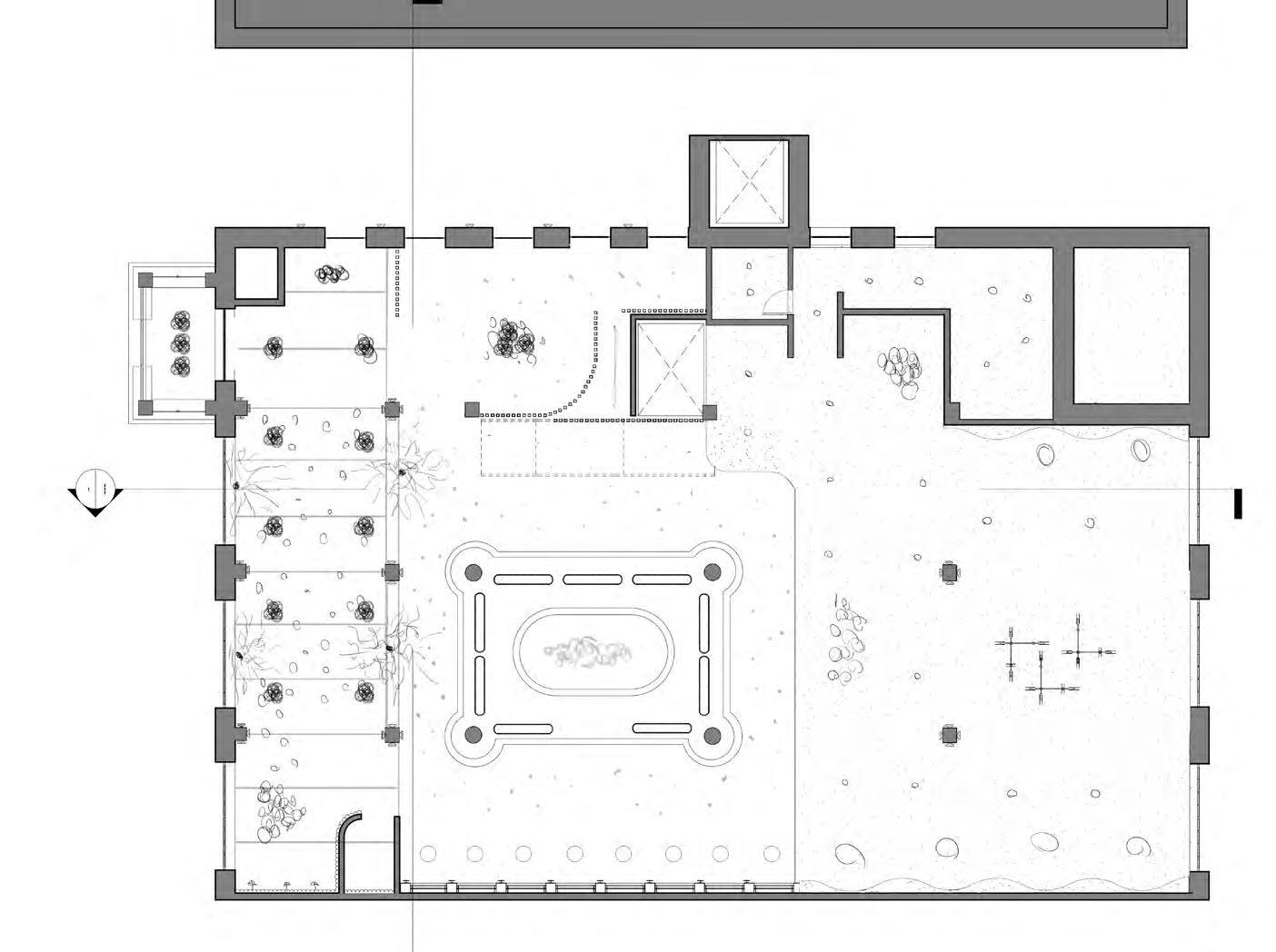The pool is suspended by marble columns. The marble columns are attached to basins of water that allow for a tranquil procession for the visitor. There are seating banquets for the public to enjoy the building and the design. The pool allows for a sense of compression when the individual processes underneath it. As you are under the pool, you are encapsulated by waterthe water is above, below and to the sides of youultimately allowing you to feel as if you are on a pier.