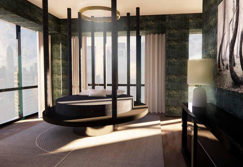 Focused on the atmosphere that a penthouse provides, the design calls the clients to appreciate the design and focus on the view. The design will emphasize colorful mediums through the inspiration of their heritage: Italian and Polish. The design becomes one with the diverse views that the windows frame. The use of curvilinear curvilinear lines and complex vignettes will explore new ways of being and living. The design suspends you high in the clouds. The design embraces open living areas for entertaining and community. The kitchen is separated from the open areas to allow for privacy. In plan, the wine storage becomes this large gesture that interacts with the dining room, family room and study, forming a larger curved mass that creates a common threshold between rooms. The owner’s bedroom develops curves with the walls and furniture. The bed is circular and suspended, overlooking the views of Center City. Together, everything works in unity to form a design focused on a levitating curve.