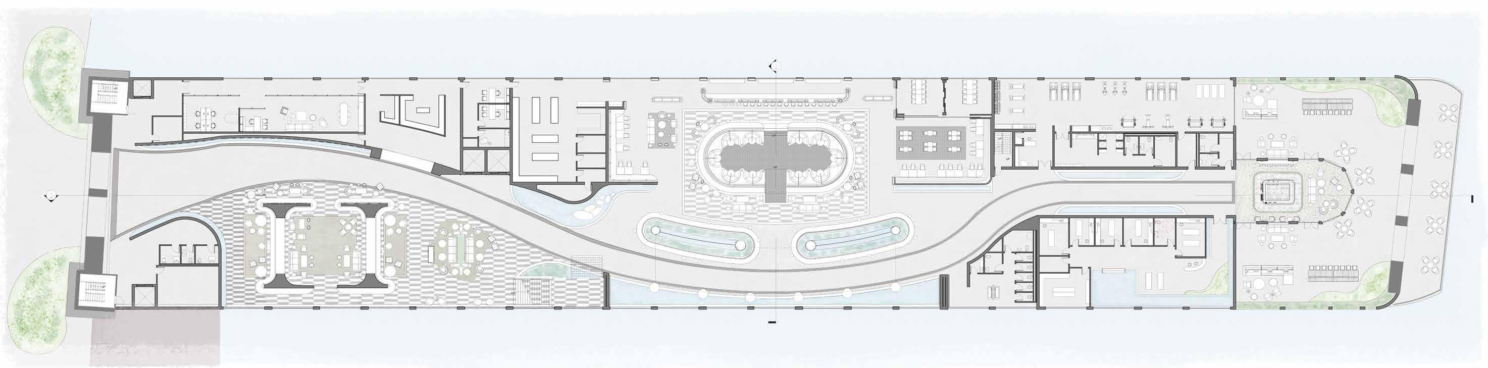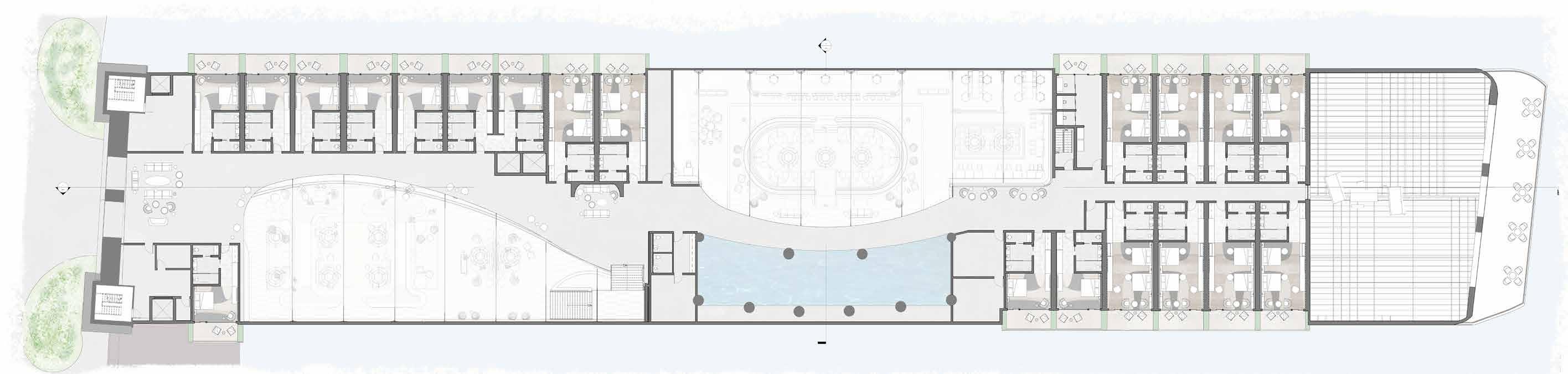 The first floor plan focuses on public spaces as well as back of house areas. The back of the house areas are placed in the front of the building in order to “force” the visitor forward to the rest of the program. As a result, the visitor sees the lounge and library from a distance. Therefore, there is anticipation to continue on the journey. As the visitor progresses forward, the water walls on both sides give a tranquil experience. The lounge is situated around an inner library to allow for a sense of privacy. The reception and waiting areas are joined to the feature stair which allows for the public to sit and wait. The stair is placed along the windows and off of the main walkway to create a sense of division and privacy for upstairs. The restaurant is situated in the center to take advantage of the Ben Franklin Bridge views that are to the north. In the center of the pier, there is a large booth that is submerged into the water while lounge areas “hug” around the central booth system. The free-dining and private dining areas are placed on opposing sides in separate coves. The gym and the spa are other amenities that are placed on the first floor. The gym takes advantage of the view, while the spa takes advantage of the quieter side of the pier. The café at the end is placed amongst the gardens to allow for an indoor-outdoor experience. The café would be used throughout the day for both the public and the user of the building. The cafe and outdoor areas are situated at the end to promote a welcoming sense of journey for all. Upstairs, there are lounge areas as well as three different types of hotel rooms (single bedroom, double bedroom, and two single suites), back of house, and working areas. The upstairs bedrooms are placed in between the truces of the building. Each hotel room has a private balcony to allow for privacy and peace. In all, Rove calls individuals to move throughout the space in a dynamic and curious way.